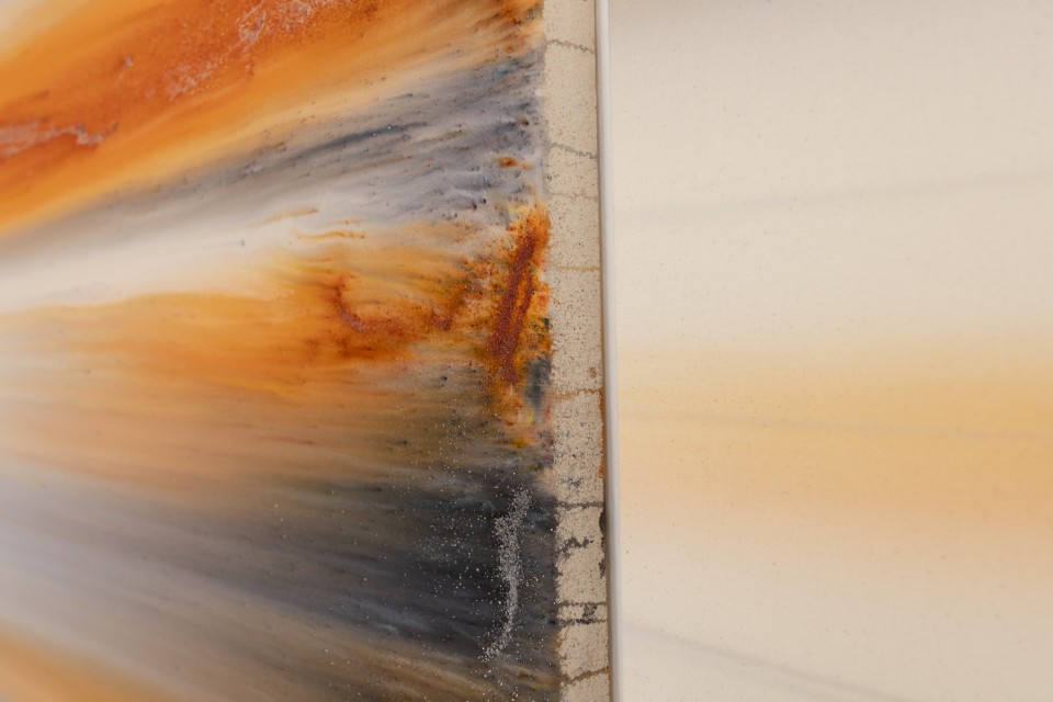 Les teintures sont travaillées à l'état liquide puis présentées fixées dans leur mouvement,