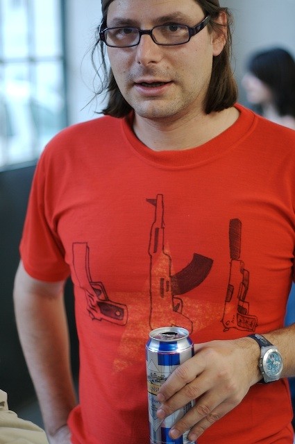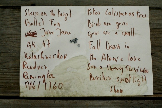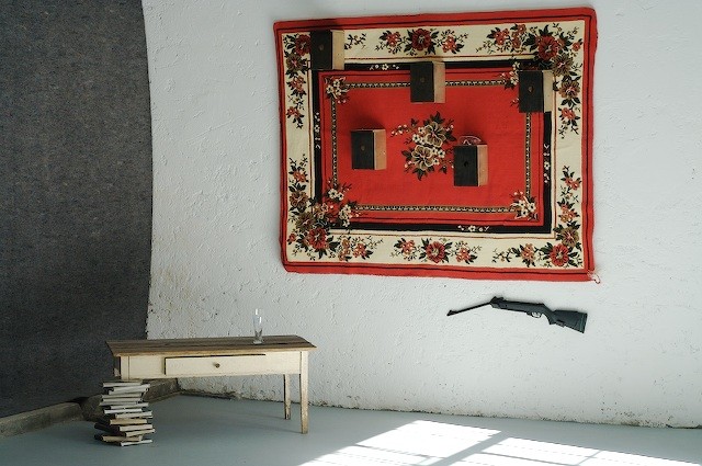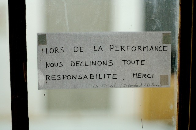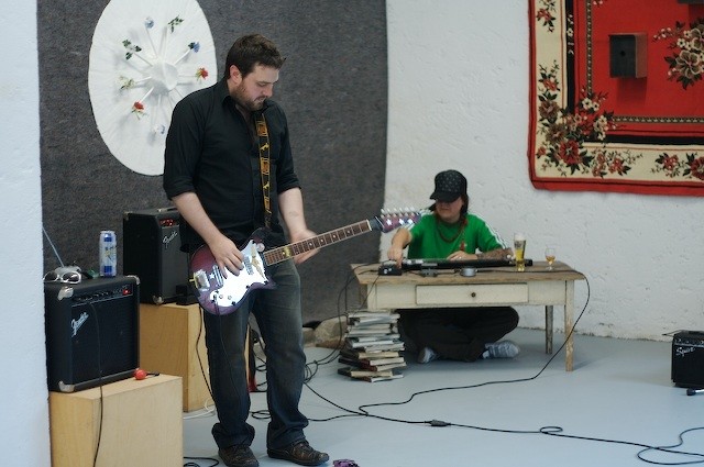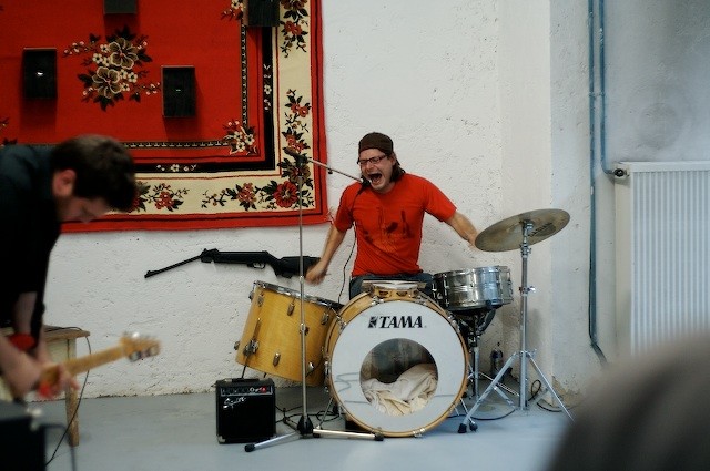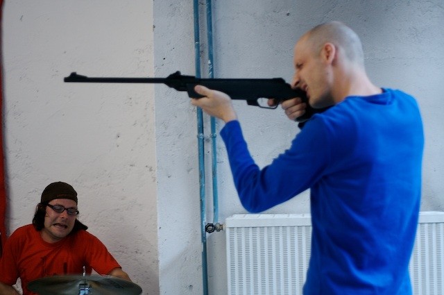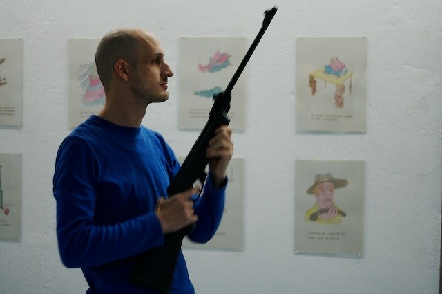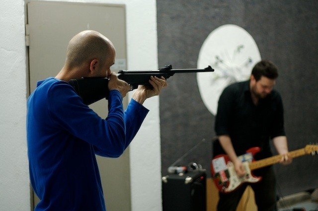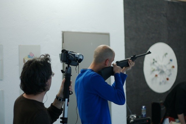 « LE LANGAGE ARTISTIQUE COMME CIBLE, COMME ARME »Tilo Steireif expose ses dessins, propose une installation et convoque pour une performance un groupe de Hardrock pour un duel en public. Le groupe Los Tres Putos est en soi un concept du fait que les trois musiciens appliquent plus d’une dizaine de dogmes.Tilo Steireif tire à la carabine en direction du groupe en plein concert. Ce dernier est placé dans une installation qui fait allusion au Luna Park. Elle est constituée d’une cible circulaire en plâtre et fleurs en plastique, d’une table basse et d’un verre à bière et de 6 boîtes cibles en bois qui cachent des cannettes de bière. Le public est composé d’amateurs de musique Hard. Les coups de fusils partent pour toucher les cibles placées derrières les musiciens. Il n’y a pas de séparation entre la scène et le public, ni entre eux et l’artiste. La réaction du public suit lorsqu’une cible est touchée reléguant la performance musicale au second plan. Ce va et vient de l’attention du public instaure un effet de malaise dans la réception de la production artistique.En 1987, Hal Foster pour un catalogue du centre George Pompidou nommé « L’Epoque, la mode, la morale et la passion » à propos d’une nouvelle génération d’artistes (Sherry Levine, Martha Rosler, Barbara Kruger ou encore Allan MC Collum) : « Chacun traite l’espace public, la représentation sociale ou le langage artistique dans lequel il/elle intervient, à la fois comme cible et comme arme ».Vingt ans plus tard, ces travaux sont muséifiés, nous paraissent hégémoniques dans la forme et ont été absorbés par l’économie marchande. Tilo Steireif crée une série d’allégories qui font allusion à la critique institutionnelle sous forme de dessins, d’installations et de performances. Elles sont vraisemblablement moins efficaces et d’une autre échelle, plus précaires et disséminées. Mais en étant multiformes et en évitant toute édification, elles peuvent s’infiltrer partout.