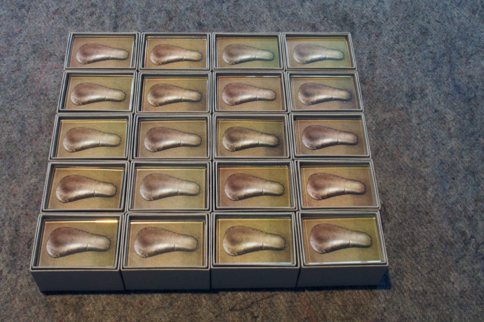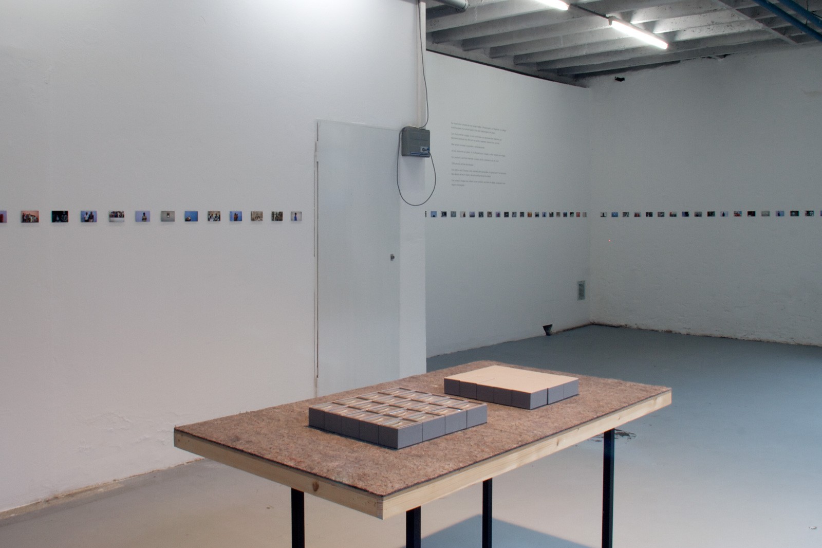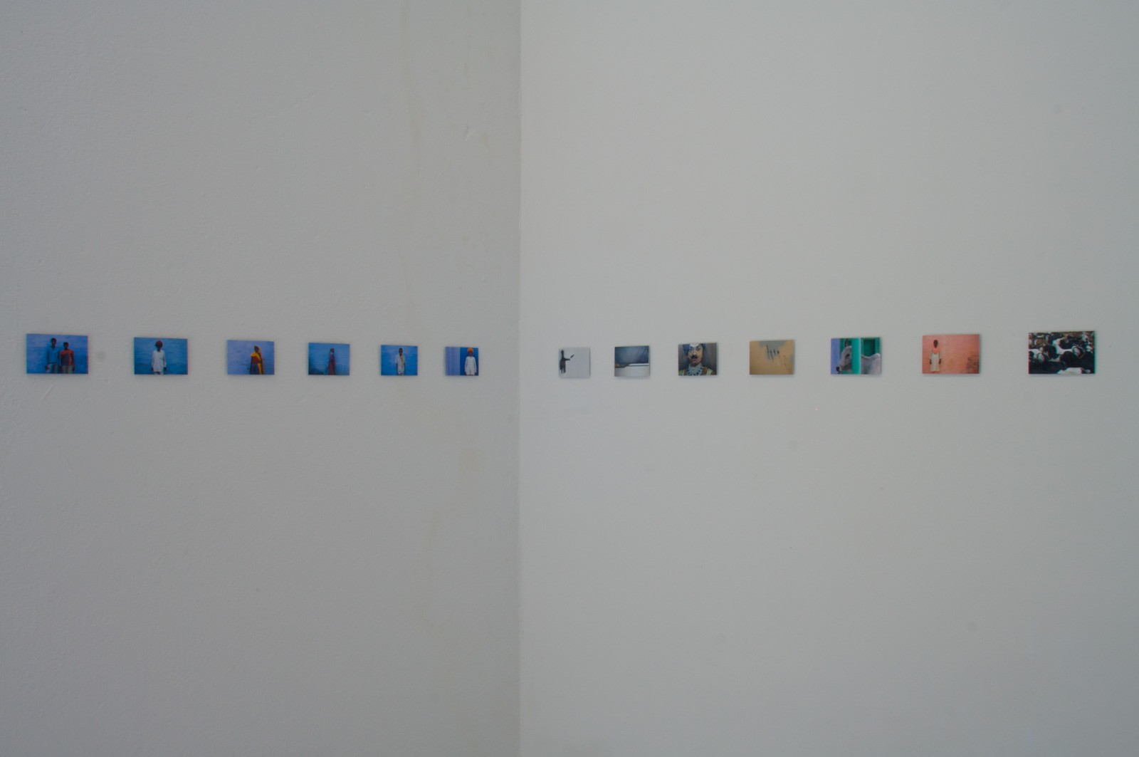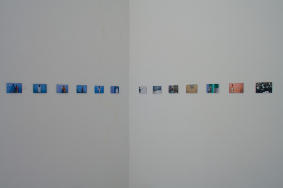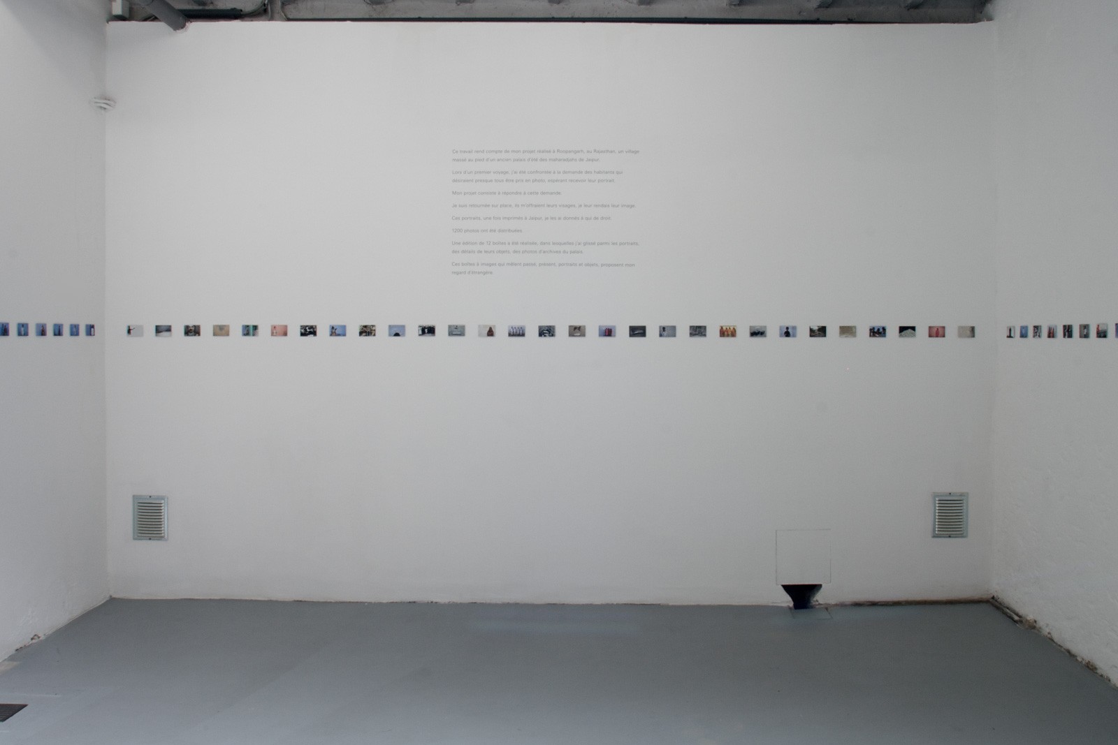 A travers son dispositif d’exposition, Anne-Hélène nous fait part de son processus de travail et de son questionnement sur les images “prises” et les images “rendues”. Comme la documentation d’une performance, d’une belle idée, elle nous propose ses boîtes à images. Petites cartes photographiques, qui avant de s’aligner sur les parois d’un lieu d’exposition, ont existé et continuent à exister, en parallèle et en simultané, sur les murs des habitants de Roopangarh.