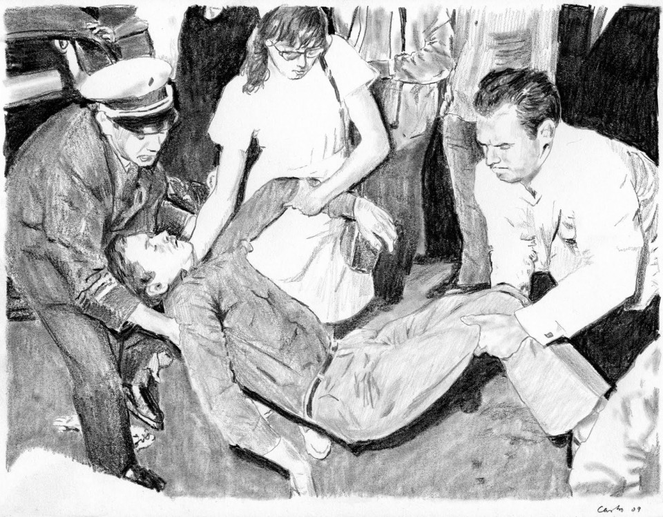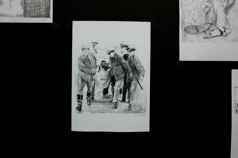 Une série de 23 dessins présente Karl-Heinz Kurras, un policier responsable de la mort de l'étudiant Benno Ohnesorg tué le 2 juin 1967 par balle pendant une manifestation. L'incident s'est produit devant l'opéra de Berlin lors d'une manifestation organisée par des étudiants contre la visite d'État du Shah d'Iran. La police est intervenue sans raison apparente, et avec la plus grande sévérité contre les étudiants. Ohnesorg fut abattu d'une balle dans l'occiput par le policier Kurras, alors que d'autres lui assenèrent simultanément plusieurs coups de matraque. L'assassinat de Benno Ohnesorg eut des conséquences. Dans le procès qui suivi, des éléments de preuve importants (y compris un morceau de crâne d'Ohnesorg) ont disparu. Des inexactitudes flagrantes ont été acceptées par le tribunal, permettant au procureur de modifier l'accusation d'homicide volontaire par homicide involontaire. Ce procès mît en lumière la brutalité de l'appareil de l'Etat, qui en l'occurrence était encore et toujours en mains d'un grand nombre d'ex-nazis. En fin de compte, Kurras fut libéré grâce à la collusion de la justice, de la police et de la presse partisane. Ces événements scandaleux ont conduit à une radicalisation du mouvement des étudiants, dont certains ont, en fin de compte, fini par choisir la voie du terrorisme.