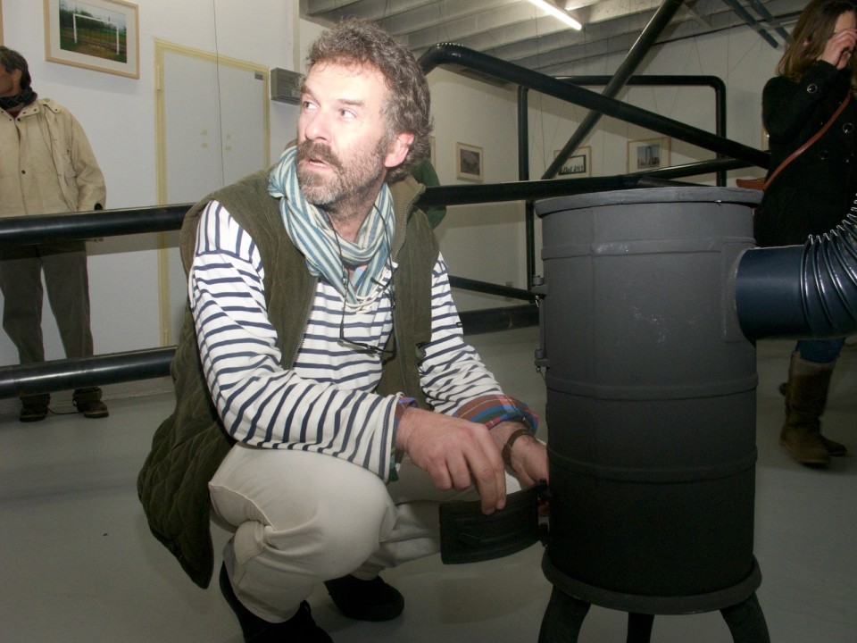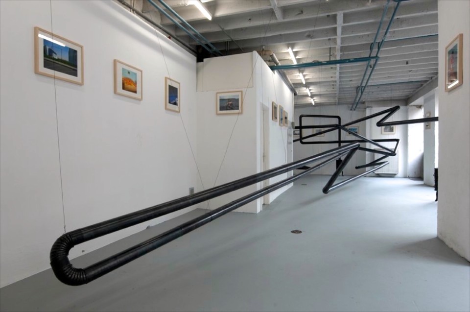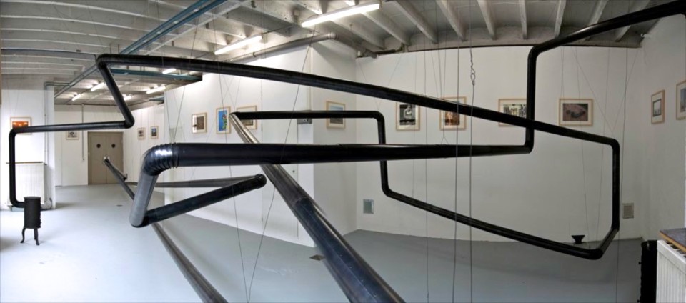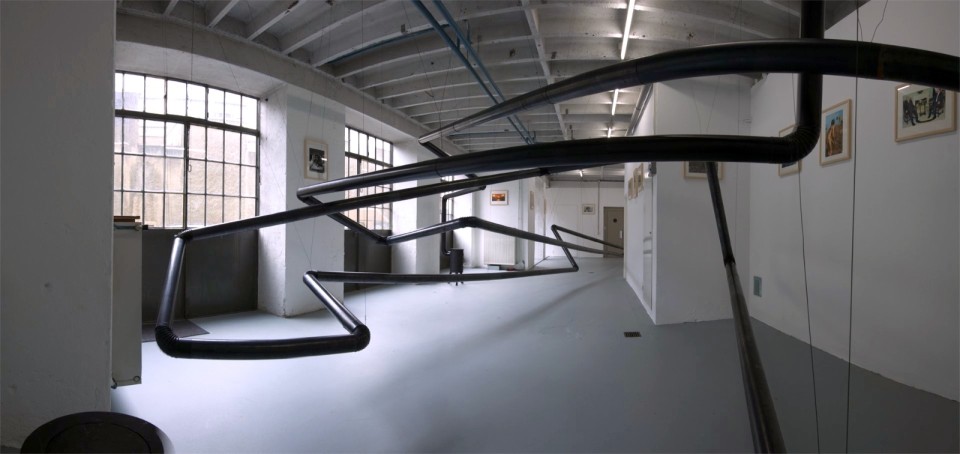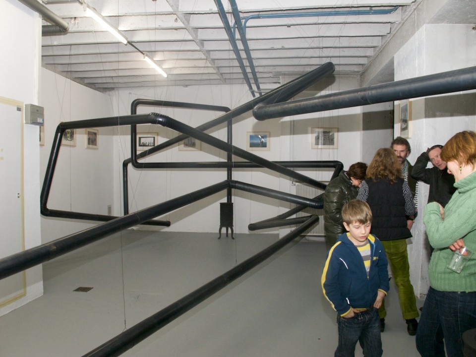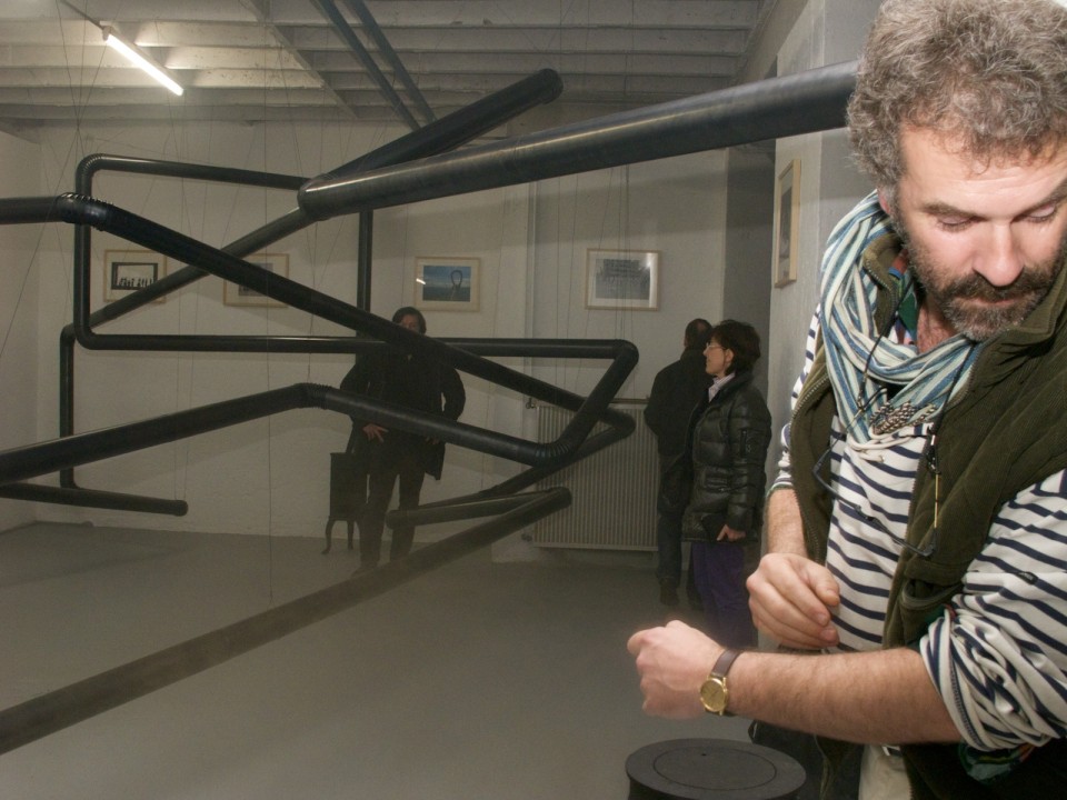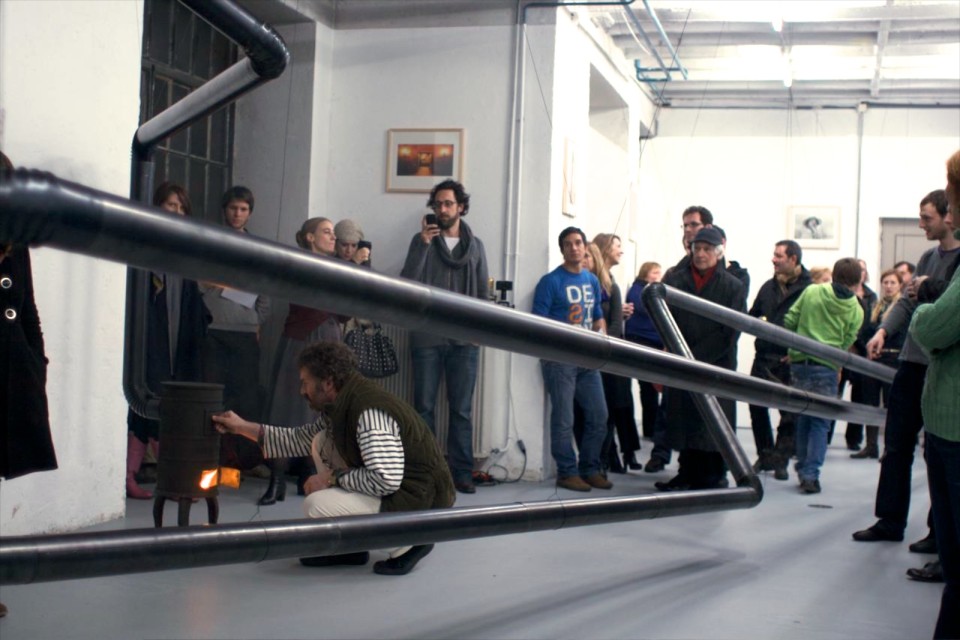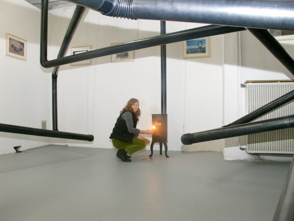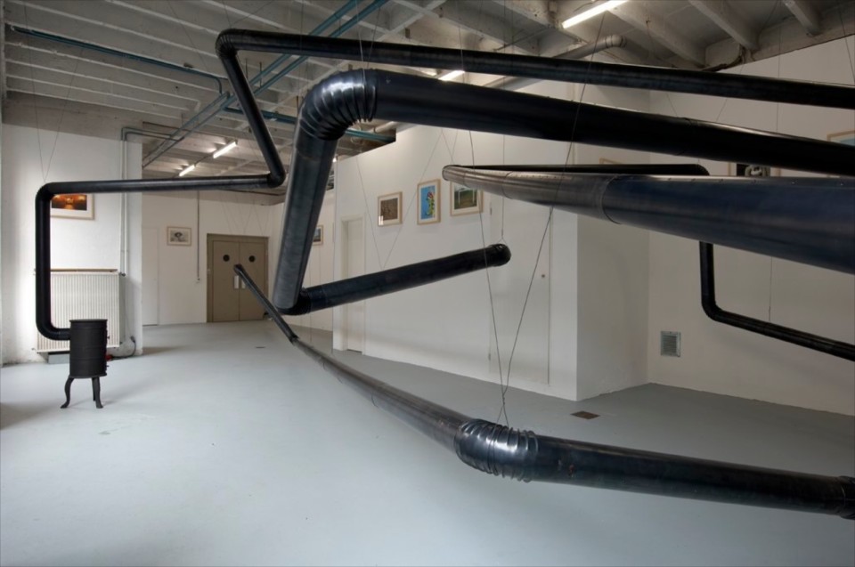 L'installation met bout à bout deux poêles reliés par un système de tuyaux de cheminée. Ceci crée comme un dessin en volume qui souligne l'espace d'exposition. Lors du vernissage les deux foyers seront allumés simultanément. La fumée fera son chemin dans le labyrinthe de tuyaux, jusqu'au moment où ne trouvant aucune sortie, elle envahira l'espace d'exposition dans un mouvement improbable, le feu des deux poêles s'étouffant jusqu'à l'extinction.