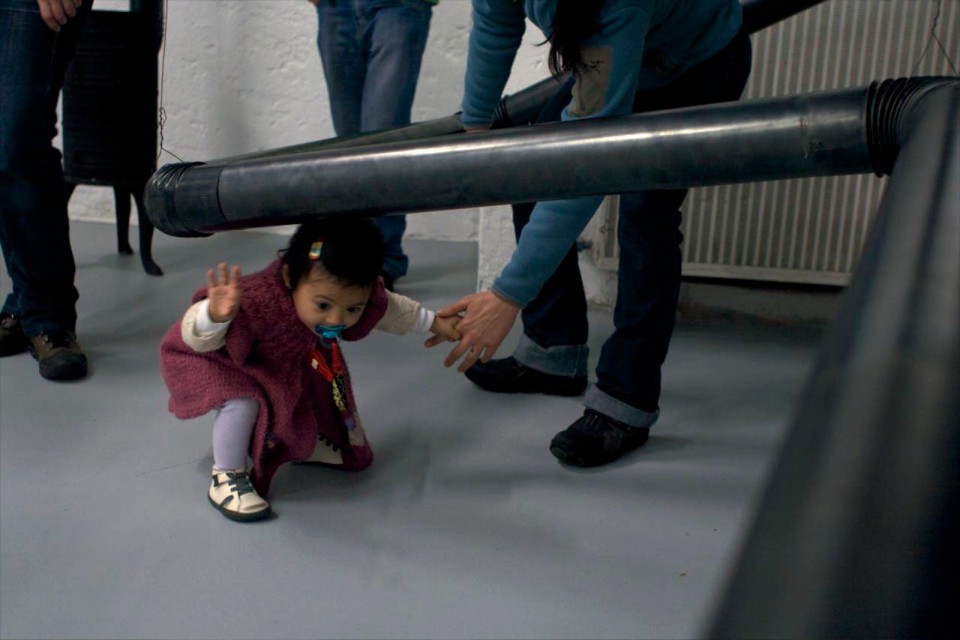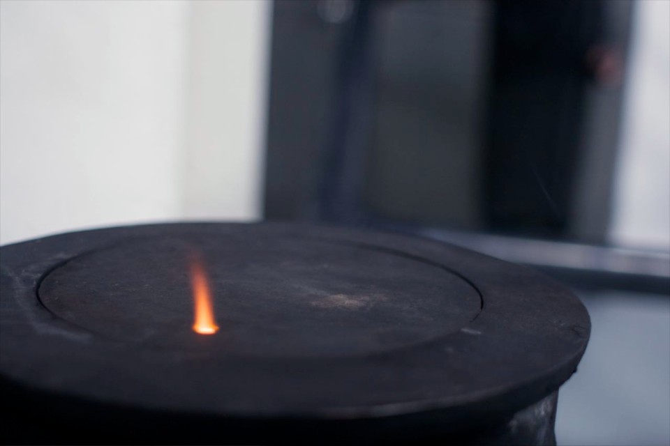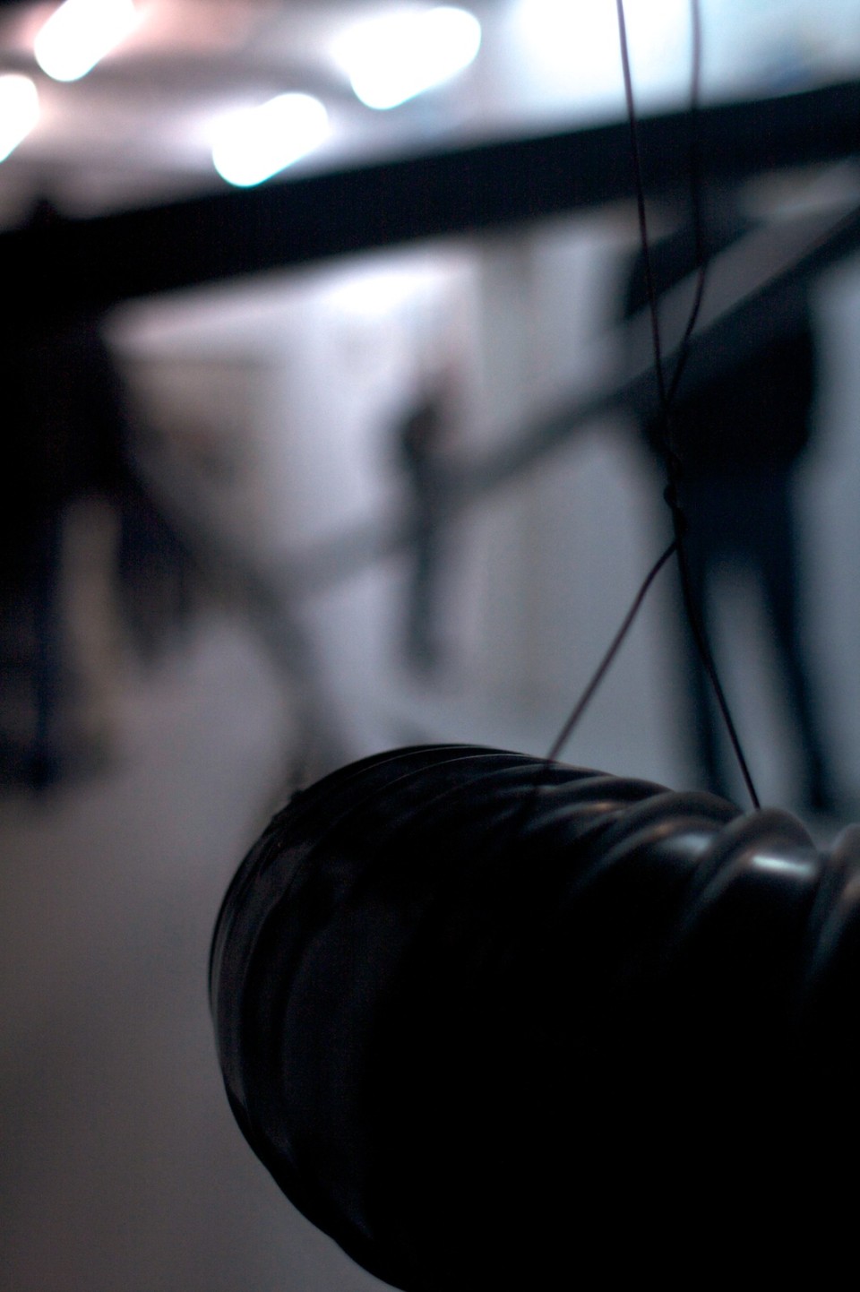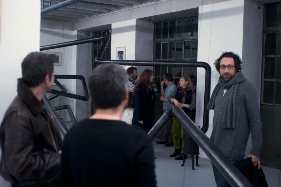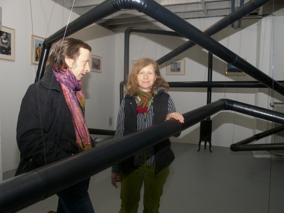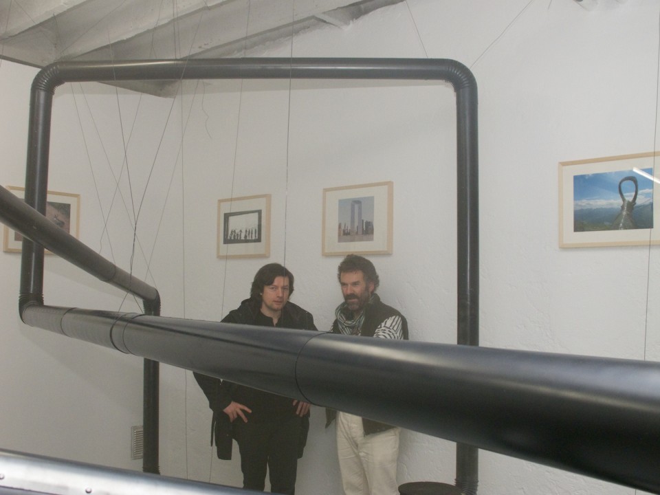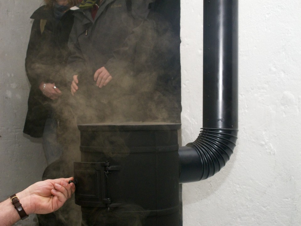 L'installation met bout à bout deux poêles reliés par un système de tuyaux de cheminée. Ceci crée comme un dessin en volume qui souligne l'espace d'exposition. Lors du vernissage les deux foyers seront allumés simultanément. La fumée fera son chemin dans le labyrinthe de tuyaux, jusqu'au moment où ne trouvant aucune sortie, elle envahira l'espace d'exposition dans un mouvement improbable, le feu des deux poêles s'étouffant jusqu'à l'extinction.