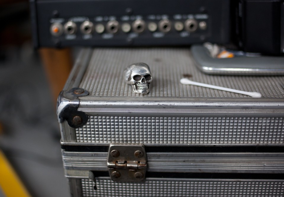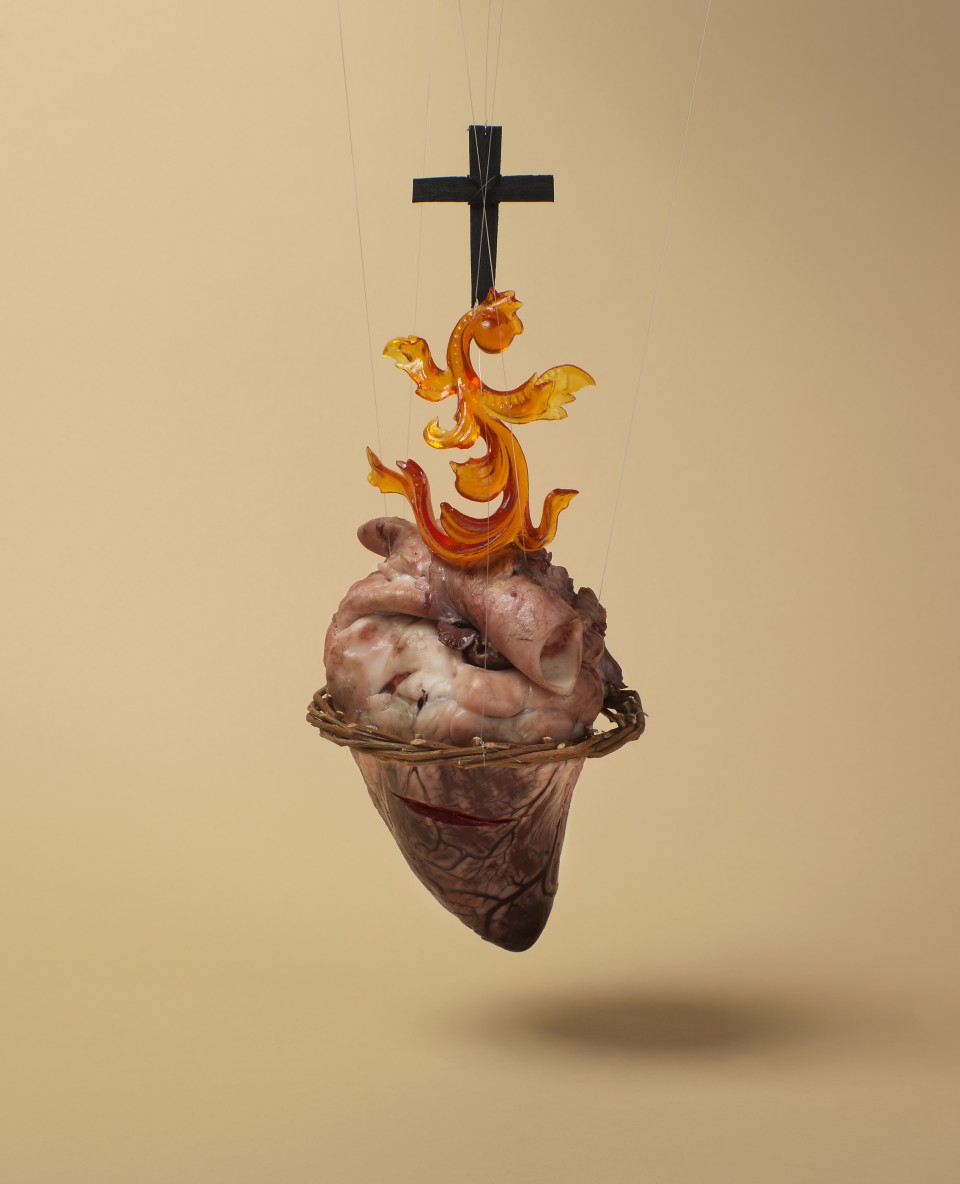 Sur une période d’environ deux ans, j’ai régulièrement tenté d’aborder cet univers par le biais de la photographie, que ce soit en immortalisant des gens de mon entourage qui sont tatoués ou en procédant à des autoportraits sur lesquels on pouvait discerner mes propres tatouages. Par la suite, j’ai opté pour une autre démarche, soit: rassembler mes diverses références et connaissances sur le sujet, qu’elles soient iconographiques, historiques ou sociologiques, dans le but d’entamer une réflexion en lien avec la notion de vanité contemporaine et ai réalisé une série de natures mortes inspirées des planches flash de tatouage (planches comportant divers dessins dont certains tatoueurs s’inspirent pour réaliser leurs motifs). J’avais alors en tête la série Still Life (Plasmorphica) des artistes Aziz et Cucher, composées d’objets usuels ou technologiques recouverts d’une espèce de peau synthétique, qui œuvrent comme des vanités. J’ai ainsi collectionné des objets qui appartiennent à l’iconographie du tatouage afin d’en réaliser des prises de vues en studio. J’ai accordé une importance particulière à leur sens en les choisissant, à leur symbolique.