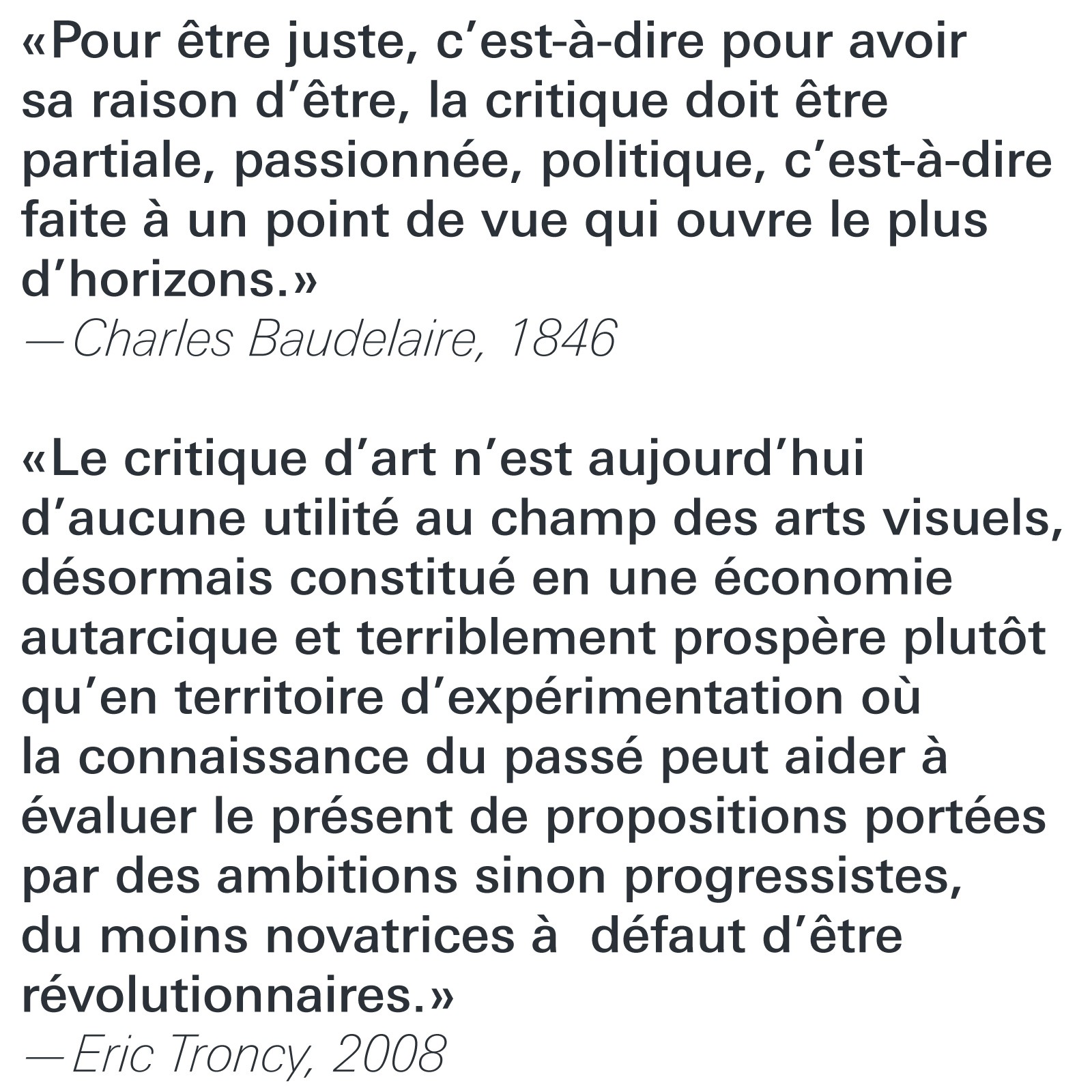 «Le critique d’art n’est aujourd’hui d’aucune utilité au champ des arts visuels, désormais constitué en une économie autarcique et terriblement prospère plutôt qu’en territoire d’expérimentation où la connaissance du passé peut aider à évaluer le présent de propositions portées par des ambitions sinon progressistes, du moins novatrices à défaut d’être révolutionnaires.»