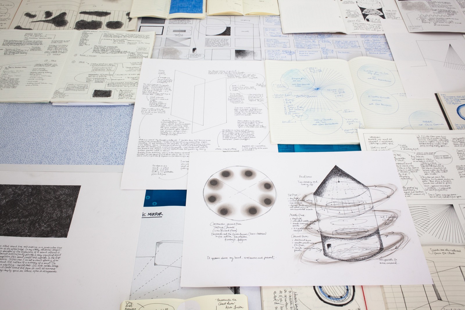 Une table, et plus spécifiquement une table vide, représente un processus intérieur. La surface supérieure de la table est conçue pour y poser des objets, pour travailler ou pour y manger, mais pour moi c’est un espace pour dessiner, réfléchir et rêver. Cet aspect physique horizontal de la surface est ce que je voulais traduire dans cette installation.