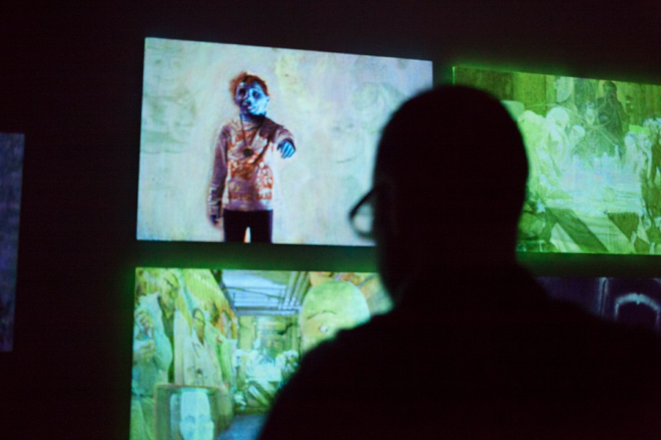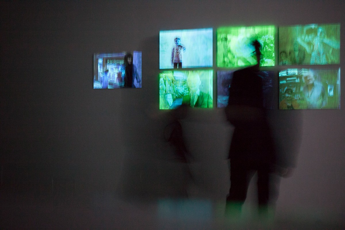 10A rue du Théâtre Booléen présenté à standard/deluxe prend la forme d’une galerie de tableaux accrochés au murs et dont la particularité de ceux-là est qu’ils se rendent visibles dans le noir, en raison de la nature phosphorescentes des pigments qui composent leur peinture. En noir et blanc sous la lumière du jour, en couleur dans la nuit.