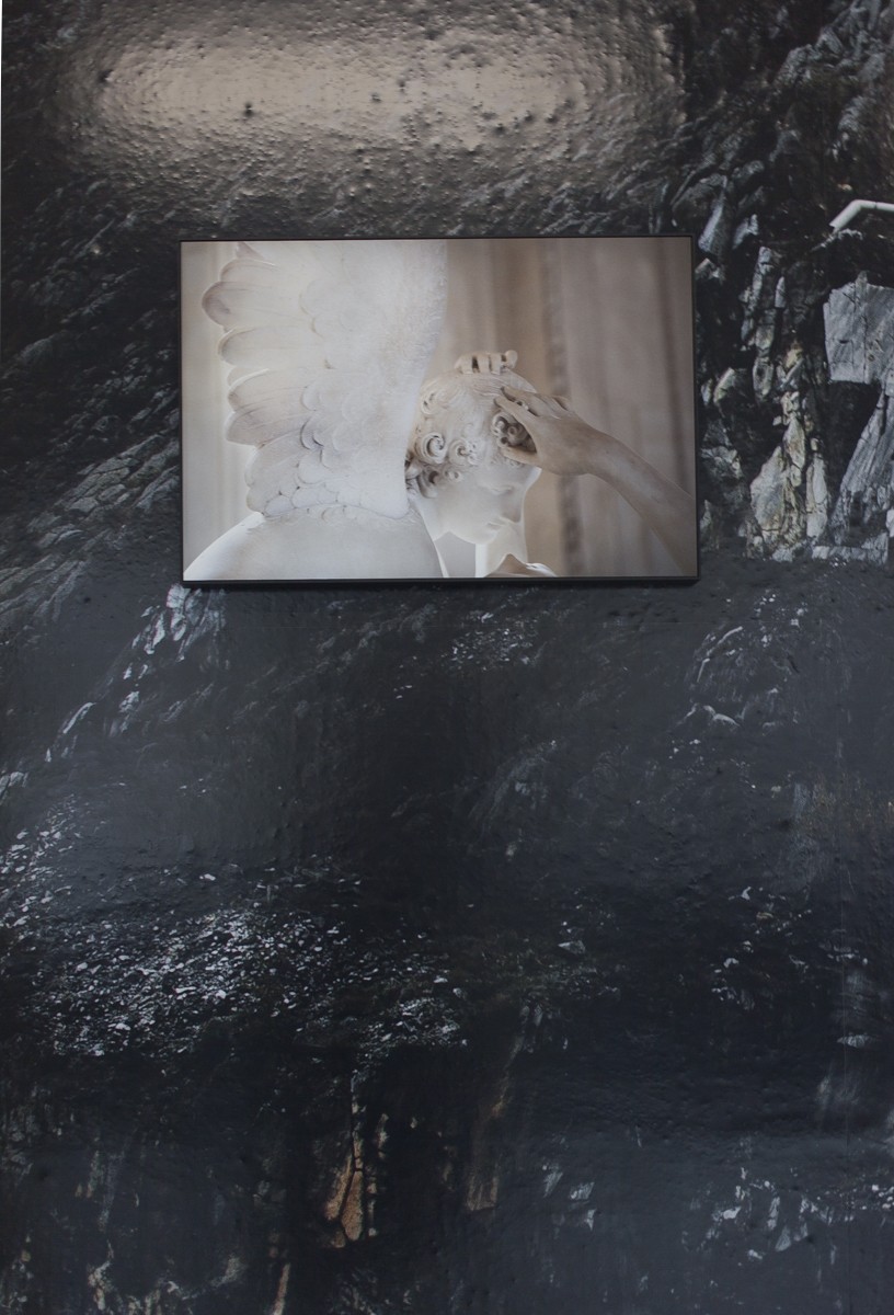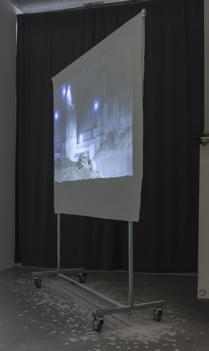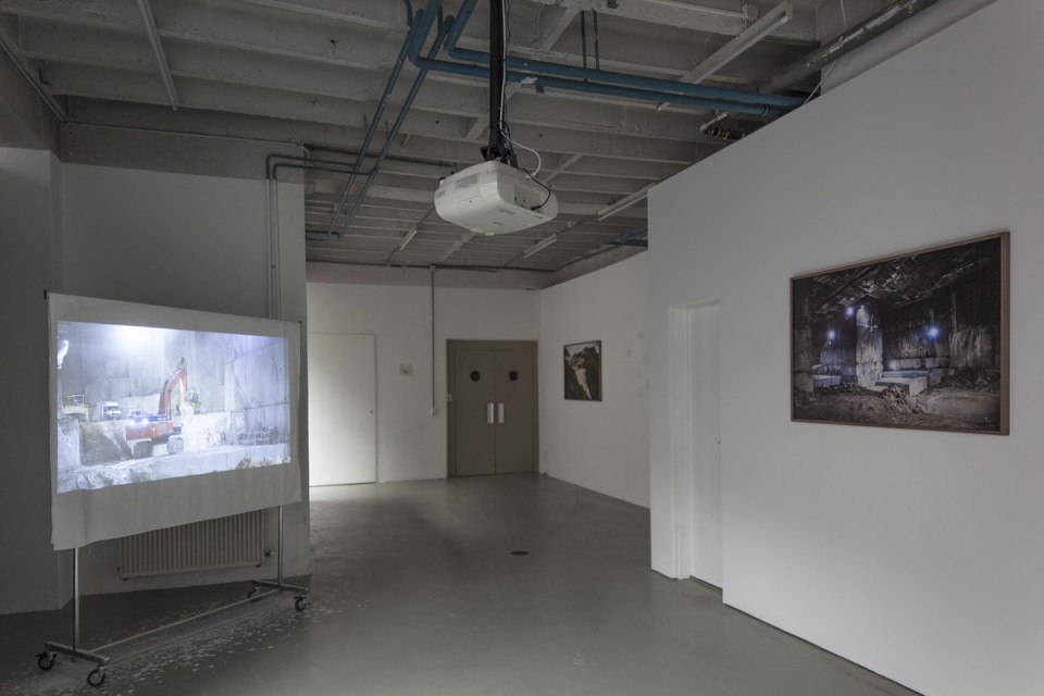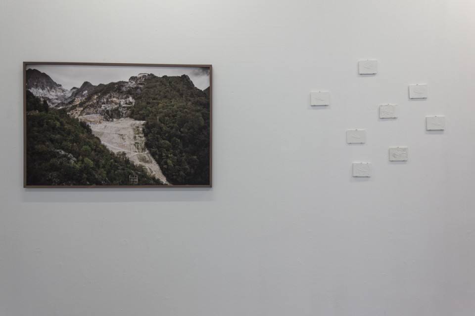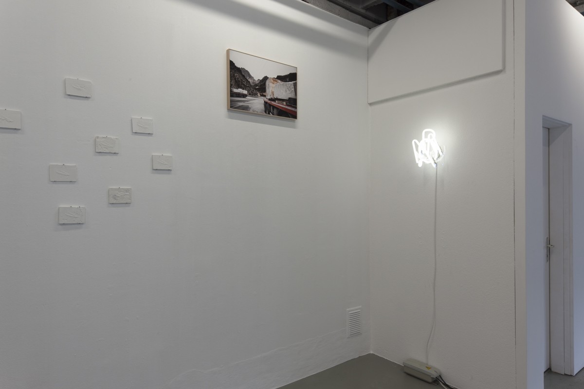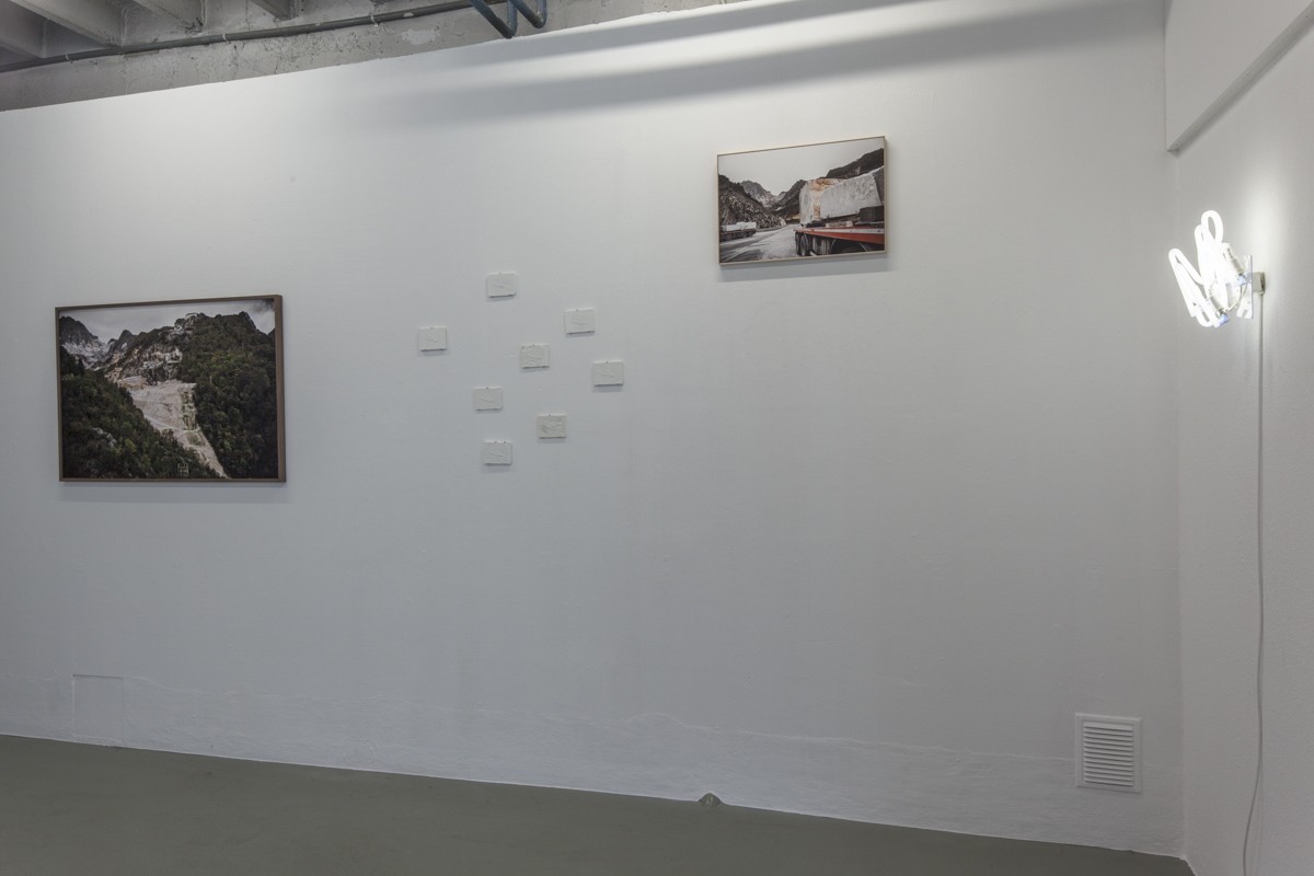 Des expérimentations à la fois gravures et bas-relief tentent de rematérialiser la poudre en minerai. Des photographies, témoins de la destruction environnementale présente, engagent une forme d’activisme par l’image qui surprend ou suspend la surexploitation du minerai. La vidéo confronte l’impossible retour de la sculpture à son lieu d’extraction, mais aussi par son dispositif la poudre et la matière première. Un néon expose une circulation entre amour et roma.