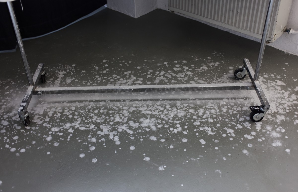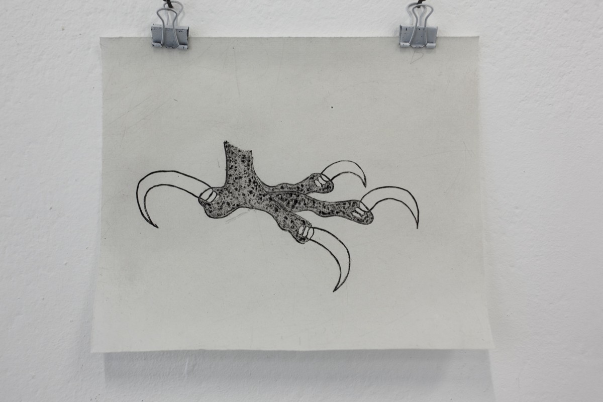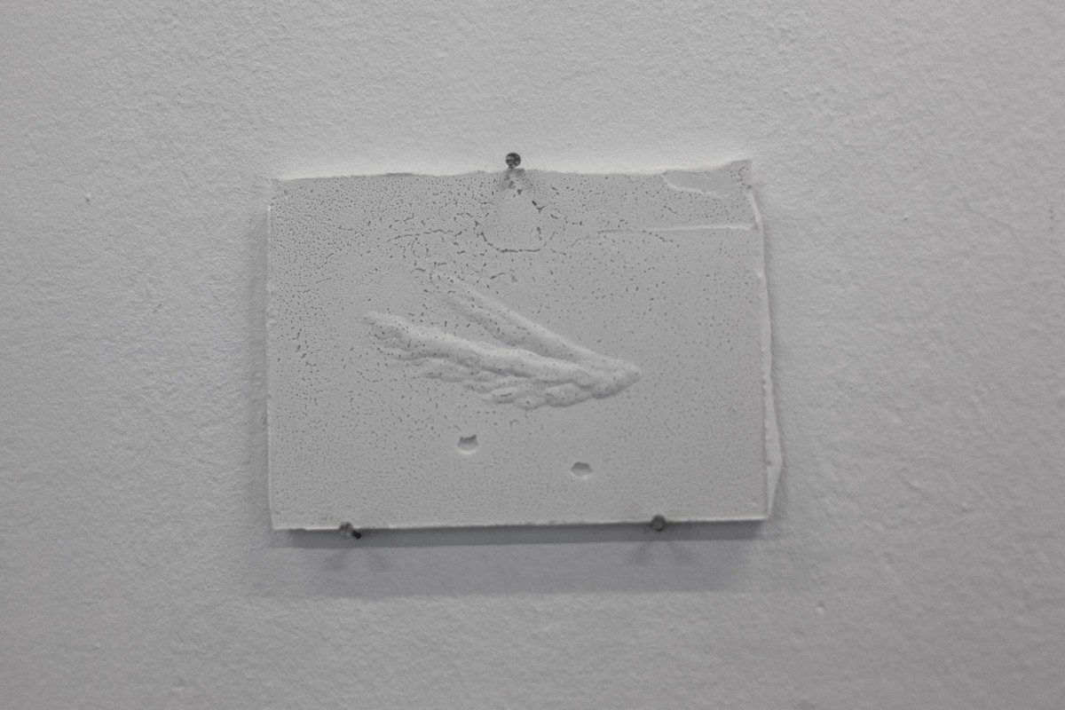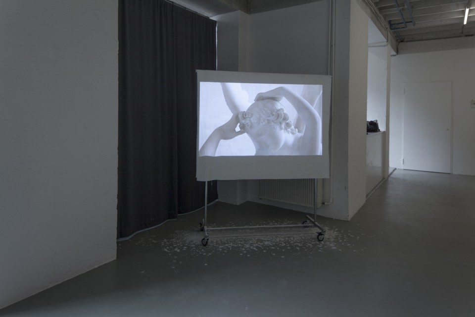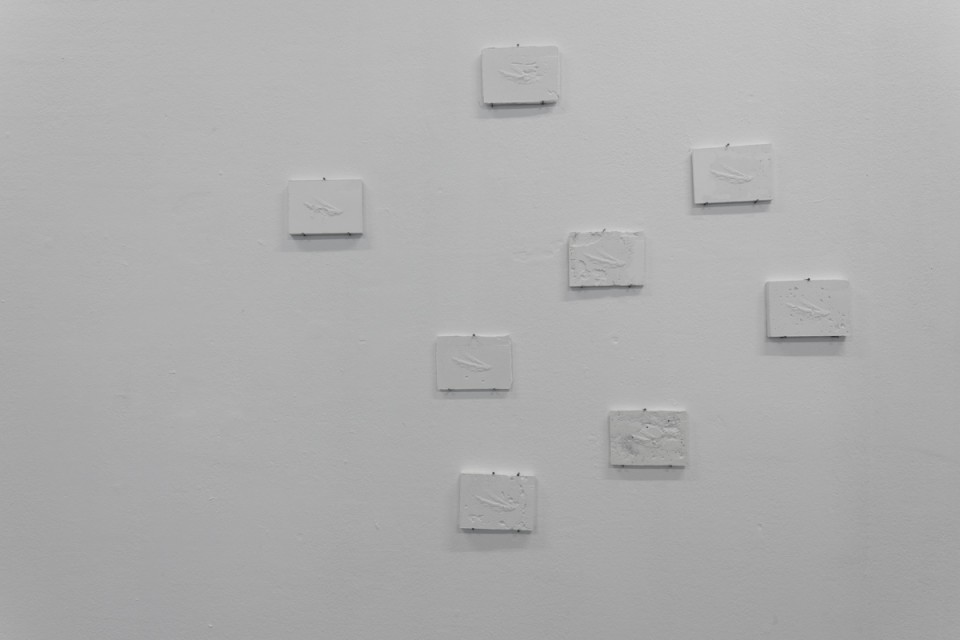 Des expérimentations à la fois gravures et bas-relief tentent de rematérialiser la poudre en minerai. Des photographies, témoins de la destruction environnementale présente, engagent une forme d’activisme par l’image qui surprend ou suspend la surexploitation du minerai. La vidéo confronte l’impossible retour de la sculpture à son lieu d’extraction, mais aussi par son dispositif la poudre et la matière première. Un néon expose une circulation entre amour et roma.