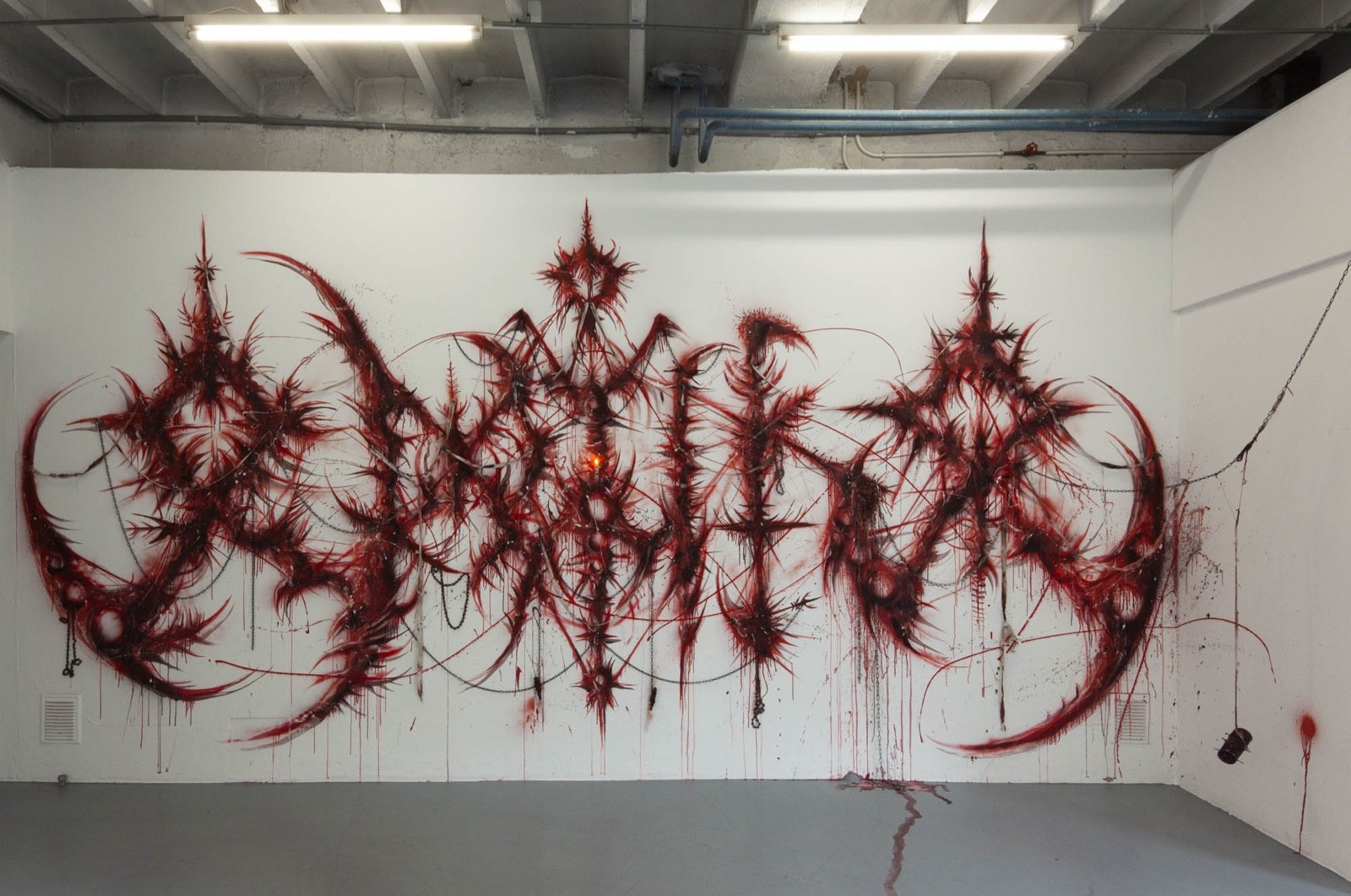 De son côté, l’artiste italien ᛟᛞᛁᚾᛟ, inscrit ses peintures dans les courants post graffiti, anti-style ou encore post vandalisme. Démarré en 2020, ce projet pictural s’est développé au-delà du nord de l’Italie. Éloigées de la culture hip hop du graffiti classique, les peintures d’ᛟᛞᛁᚾᛟ se nourrissent de l’esthétique acérée et païenne du black metal accompagnée de la vision surréaliste de la mythologie scandinave.