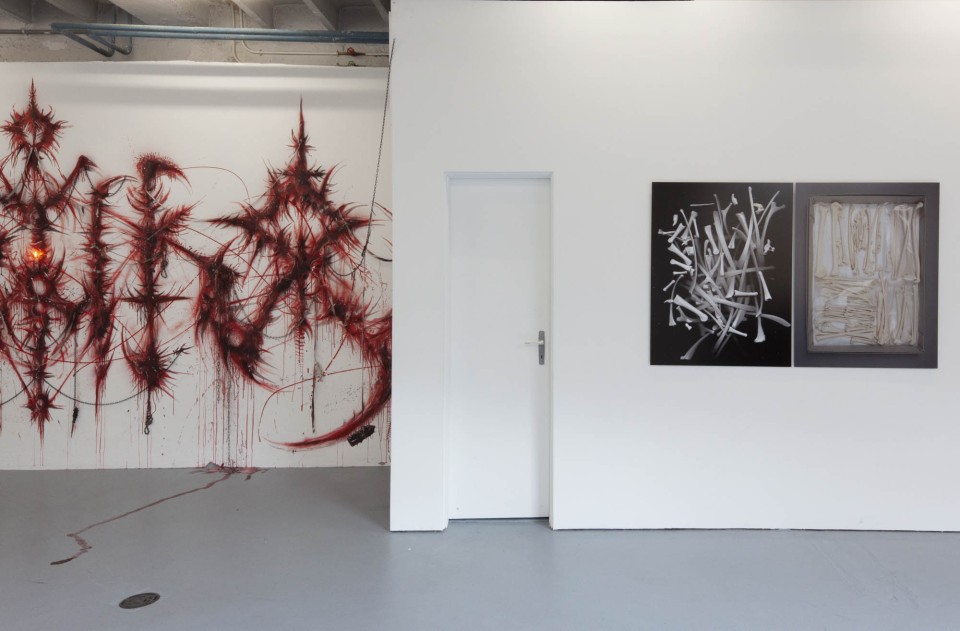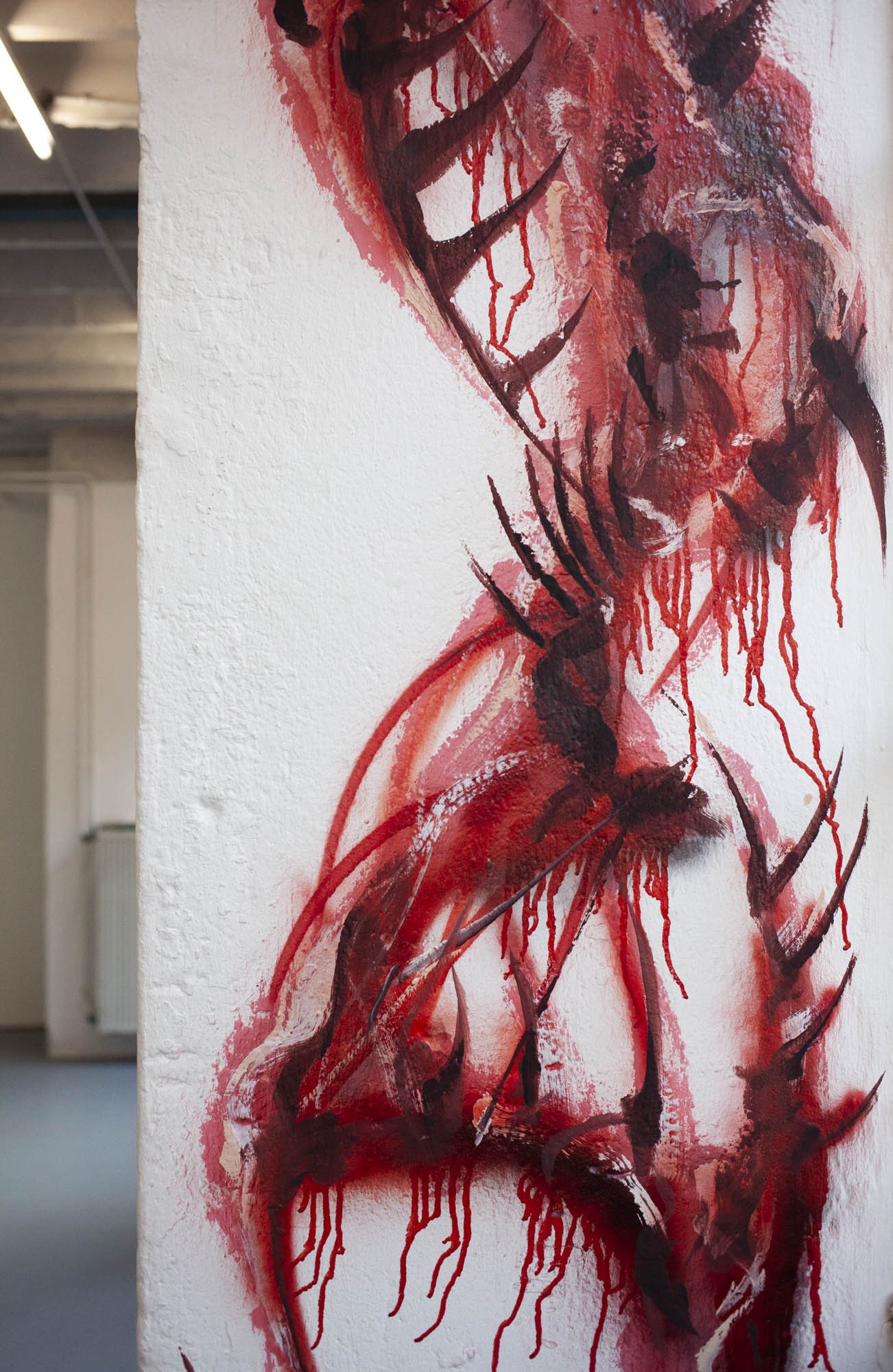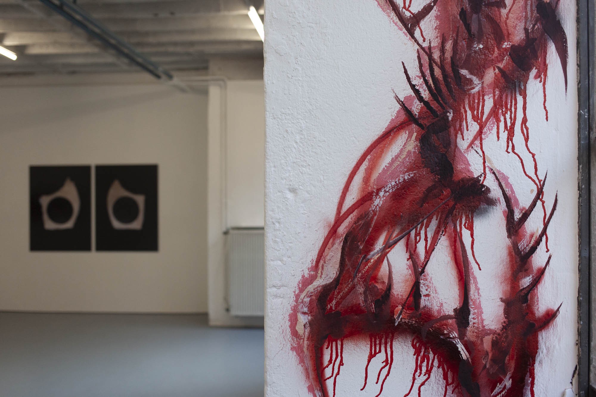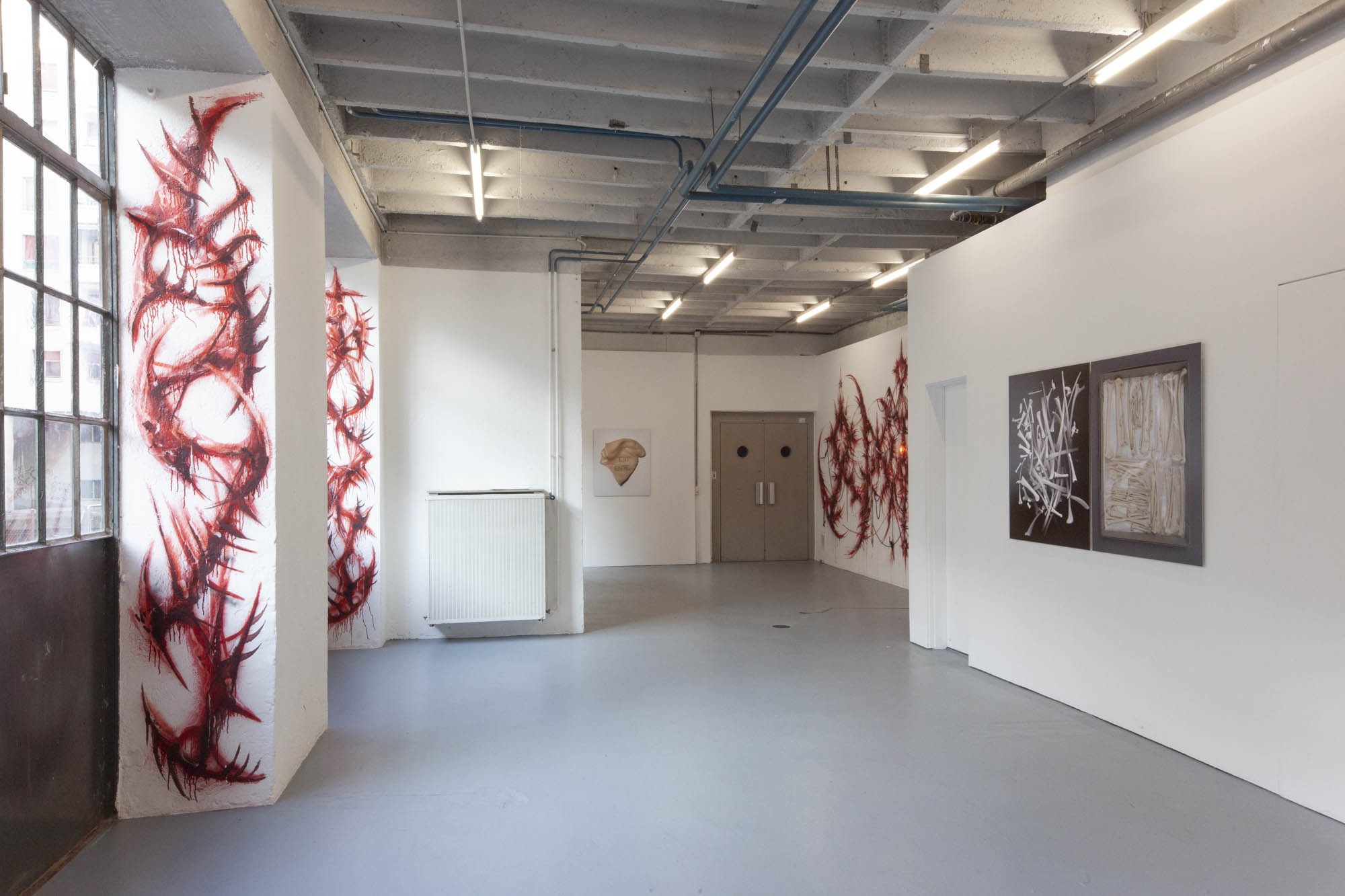Sabrina Biro et ᛟᛞᛁᚾᛟ ont réalisé spécialement pour cette exposition une série de photographies, des sculptures et des peintures murales. Brutales et à la fois séduisantes, les oeuvres de ces deux artistes interrogent la fascination que nous pouvons entretenir avec la mort et ses représentations. Les vanités dépeintes dans l’histoire de l’art occidentales, à savoir des images représentants des ossements ou tout objets ayant un lien direct avec la mort, possédaient différentes significations mais convergeaient sur la même idée. Peu importe notre classe sociale, savoir, identité ou richesses, nous finirons tous·x·tes en poussière. Notre relation à la mort s’est développée ces dernières décennies avec le cinéma et les séries. D’une réflexion philosophique, notre oeil s’est orienté vers un attrait pour l’organique, le sensationnel. Sabrina Biro et ᛟᛞᛁᚾᛟ illustrent ce glissement sémantique et esthétique chacun·e à leur manière. Du Memento mori au gore, At the heart of it all propose au public une expérience sensorielle.
