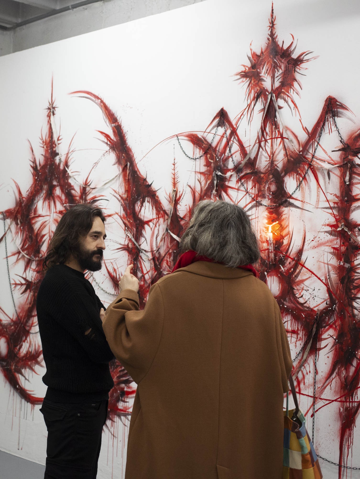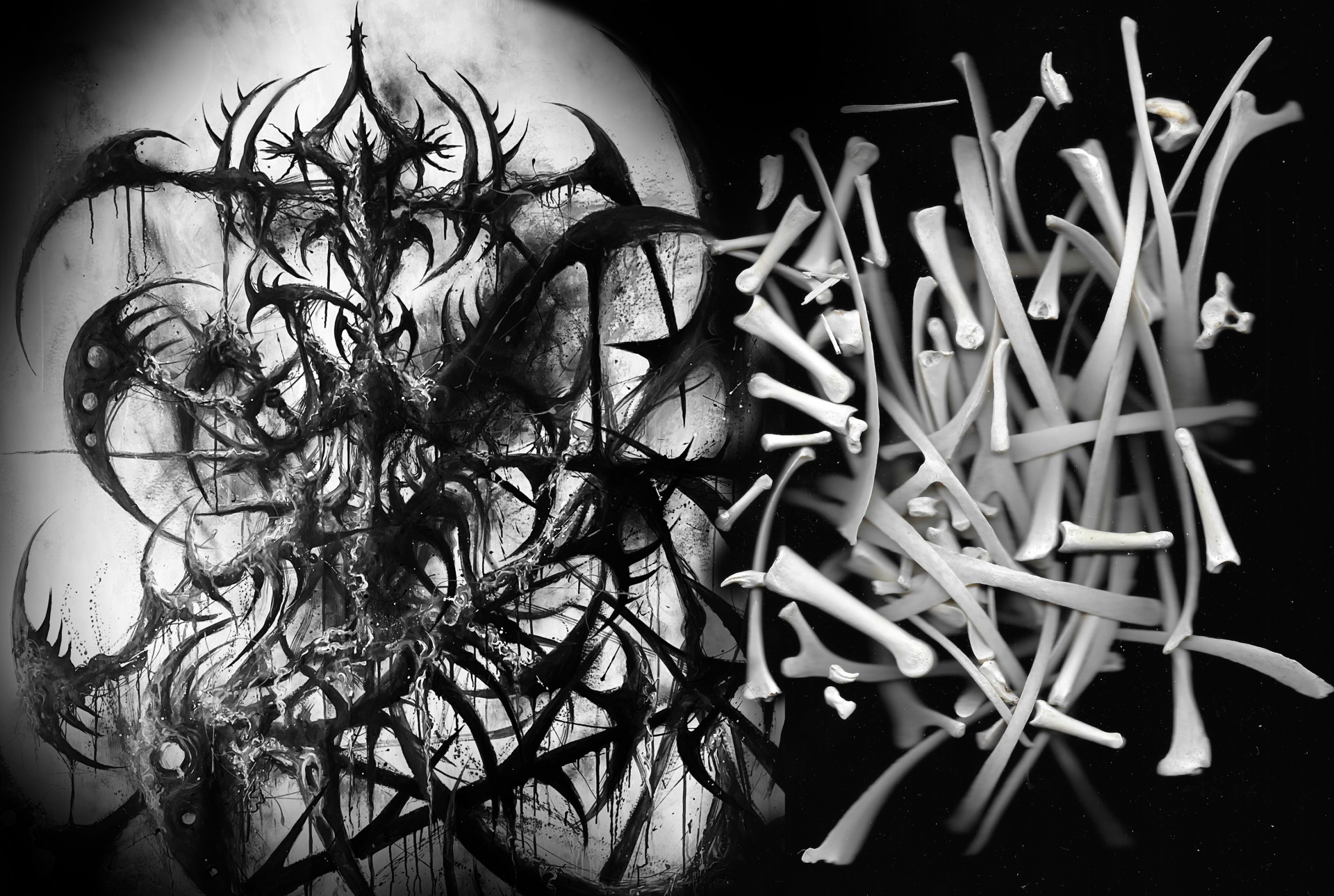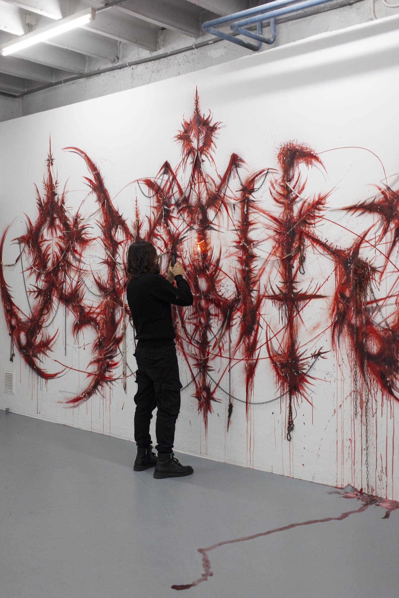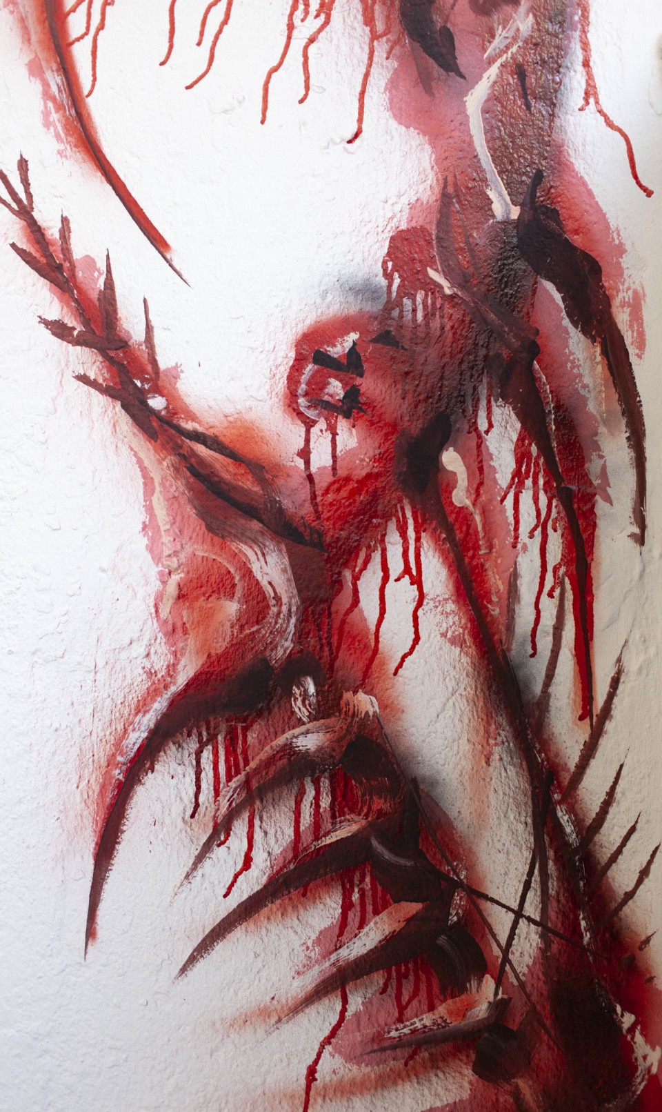 Sabrina Biro et ᛟᛞᛁᚾᛟ ont réalisé spécialement pour cette exposition une série de photographies, des sculptures et des peintures murales. Brutales et à la fois séduisantes, les oeuvres de ces deux artistes interrogent la fascination que nous pouvons entretenir avec la mort et ses représentations. Les vanités dépeintes dans l’histoire de l’art occidentales, à savoir des images représentants des ossements ou tout objets ayant un lien direct avec la mort, possédaient différentes significations mais convergeaient sur la même idée. Peu importe notre classe sociale, savoir, identité ou richesses, nous finirons tous·x·tes en poussière. Notre relation à la mort s’est développée ces dernières décennies avec le cinéma et les séries. D’une réflexion philosophique, notre oeil s’est orienté vers un attrait pour l’organique, le sensationnel. Sabrina Biro et ᛟᛞᛁᚾᛟ illustrent ce glissement sémantique et esthétique chacun·e à leur manière. Du Memento mori au gore, At the heart of it all propose au public une expérience sensorielle.