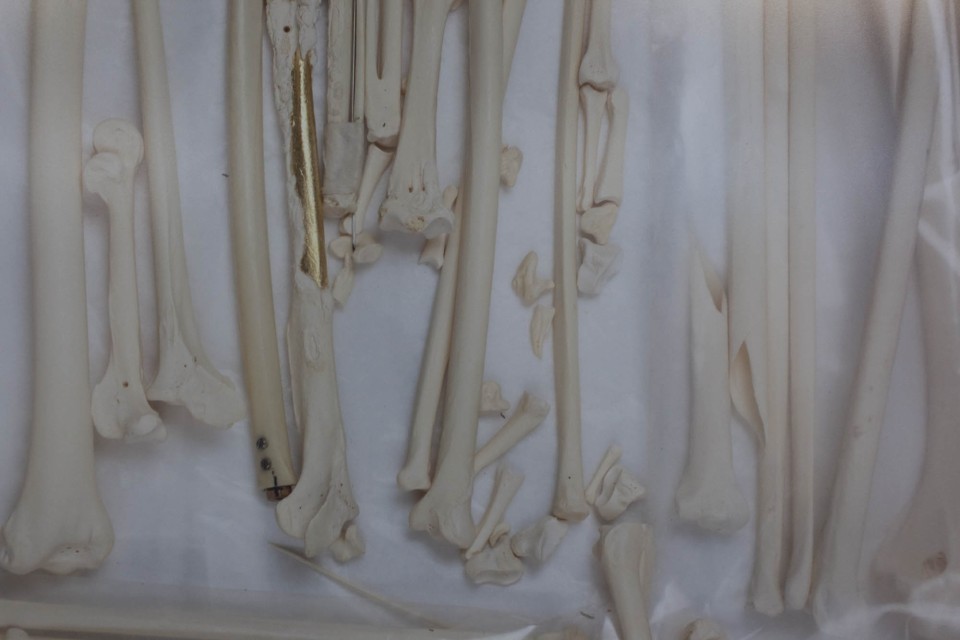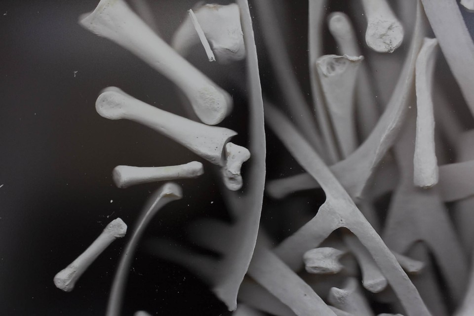 L’artiste lausannoise Sabrina Biro, taxidermiste de formation, récupère des dépouilles inutiles au Musée cantonal de zoologie de Lausanne. Elle travaille ensuite sur ce matériau, blanchi les os, les orne ou les transforme. L’intention est de retenir quelque chose, un peu comme le fait la photographie, garder une individualité, une trace du vivant. Elle tatoue des textes sur des oreilles de porc, marque, trace, s’approprie des chairs qui ne lui appartiennent pas, s’essaie aux machines de traçage. Sabrina Biro entretient une relation particulière avec le vivant. Iconoclasme doux, elle joue avec nos idées de la mort et, surtout, sur la dépossession de notre enveloppe charnelle.