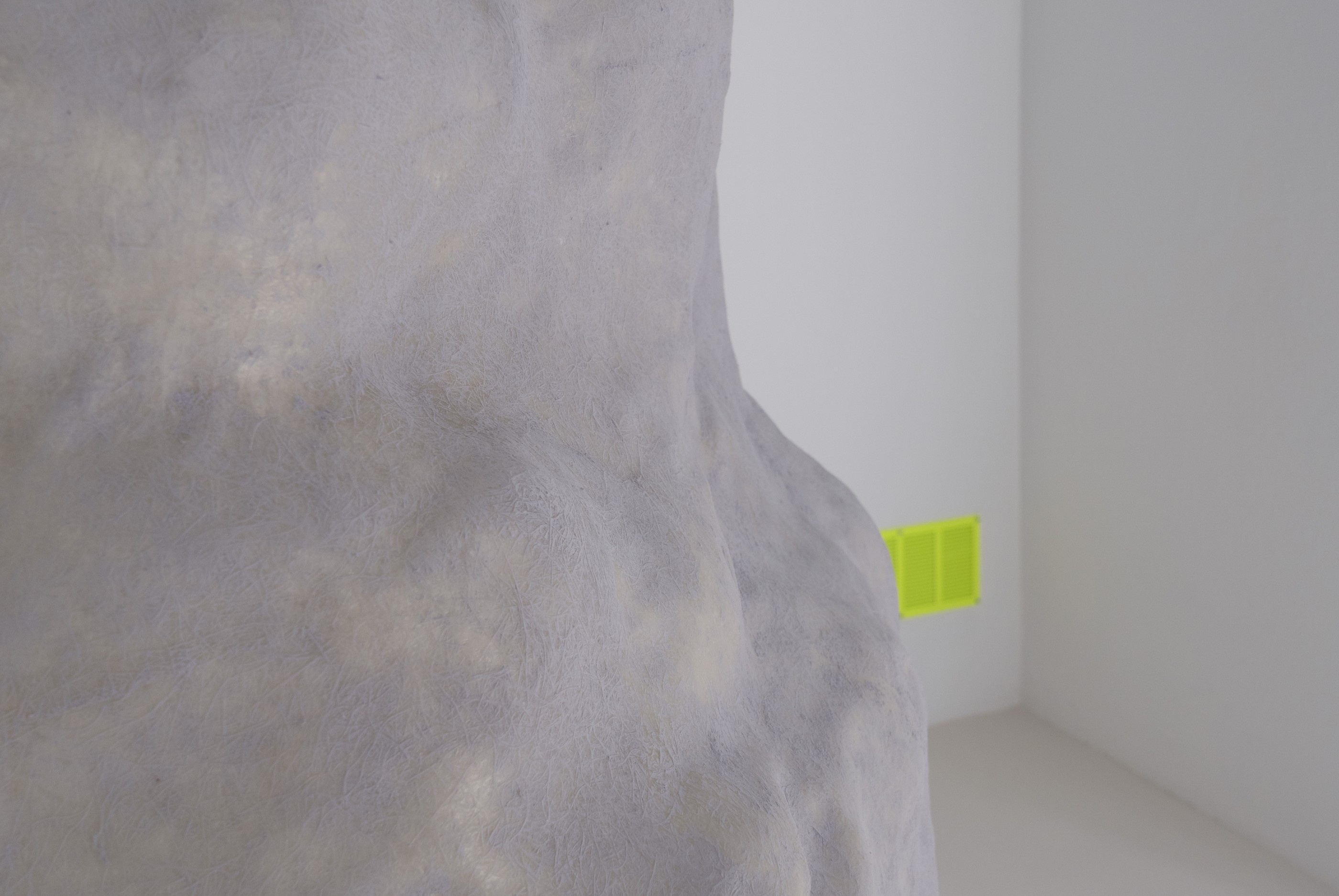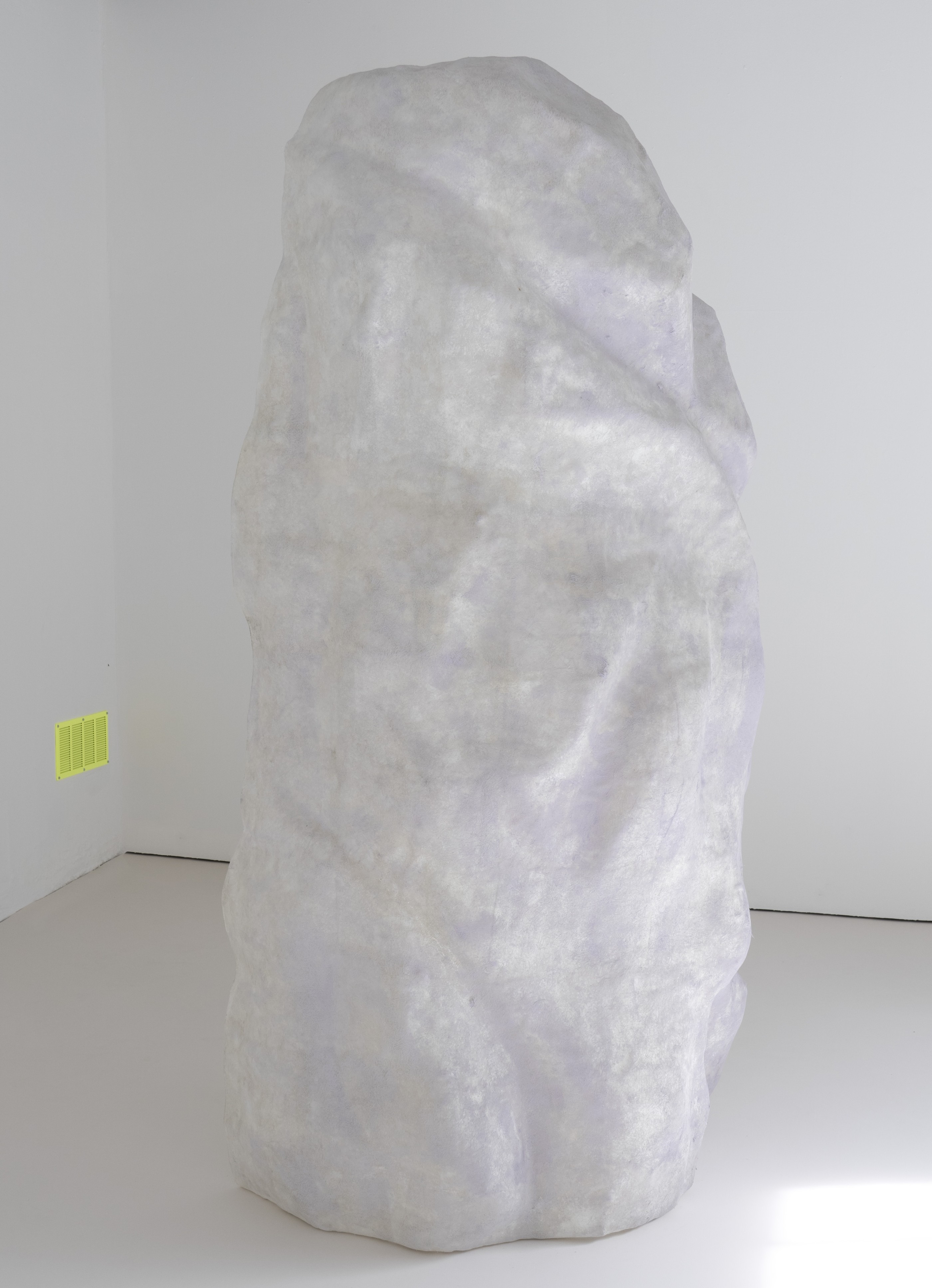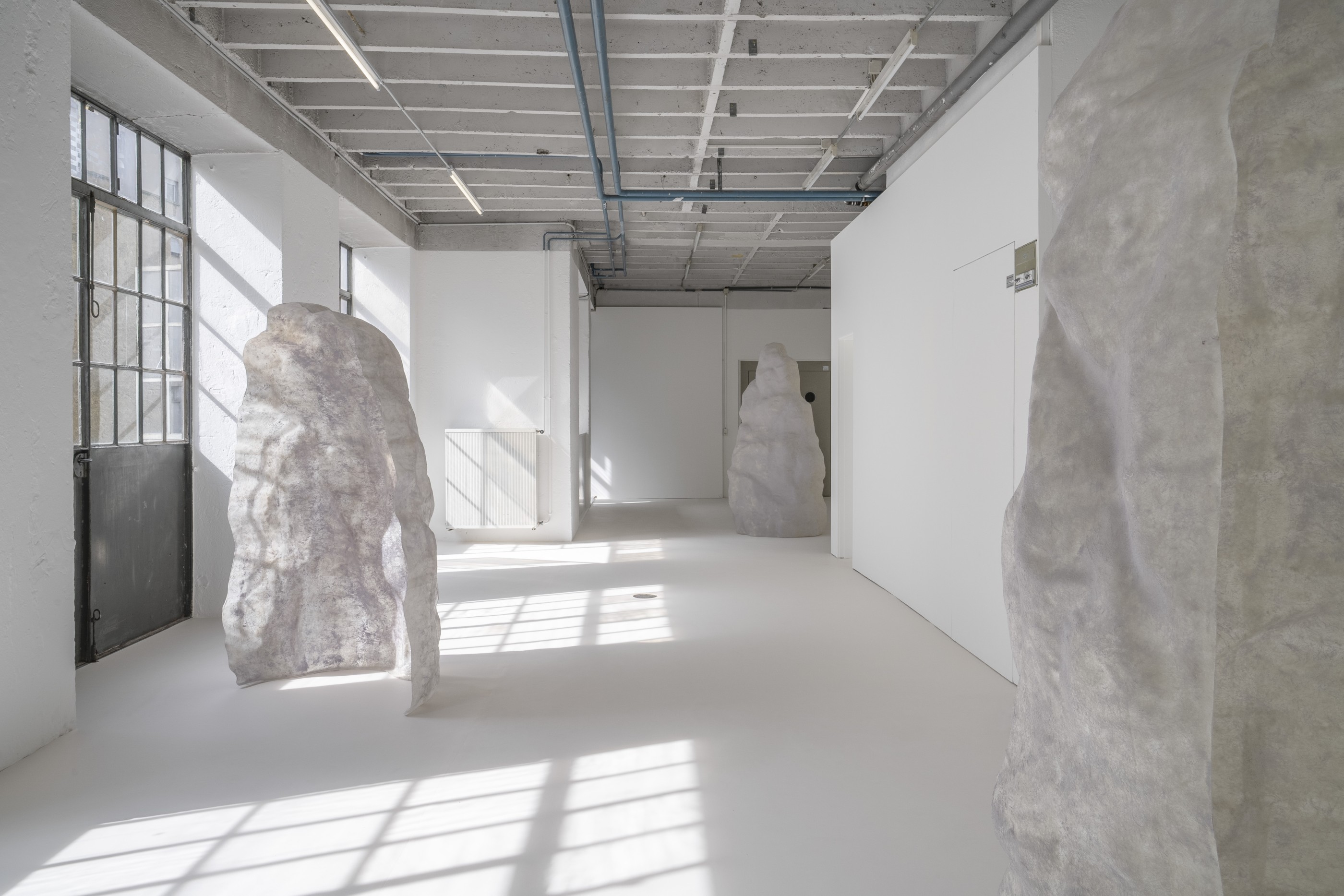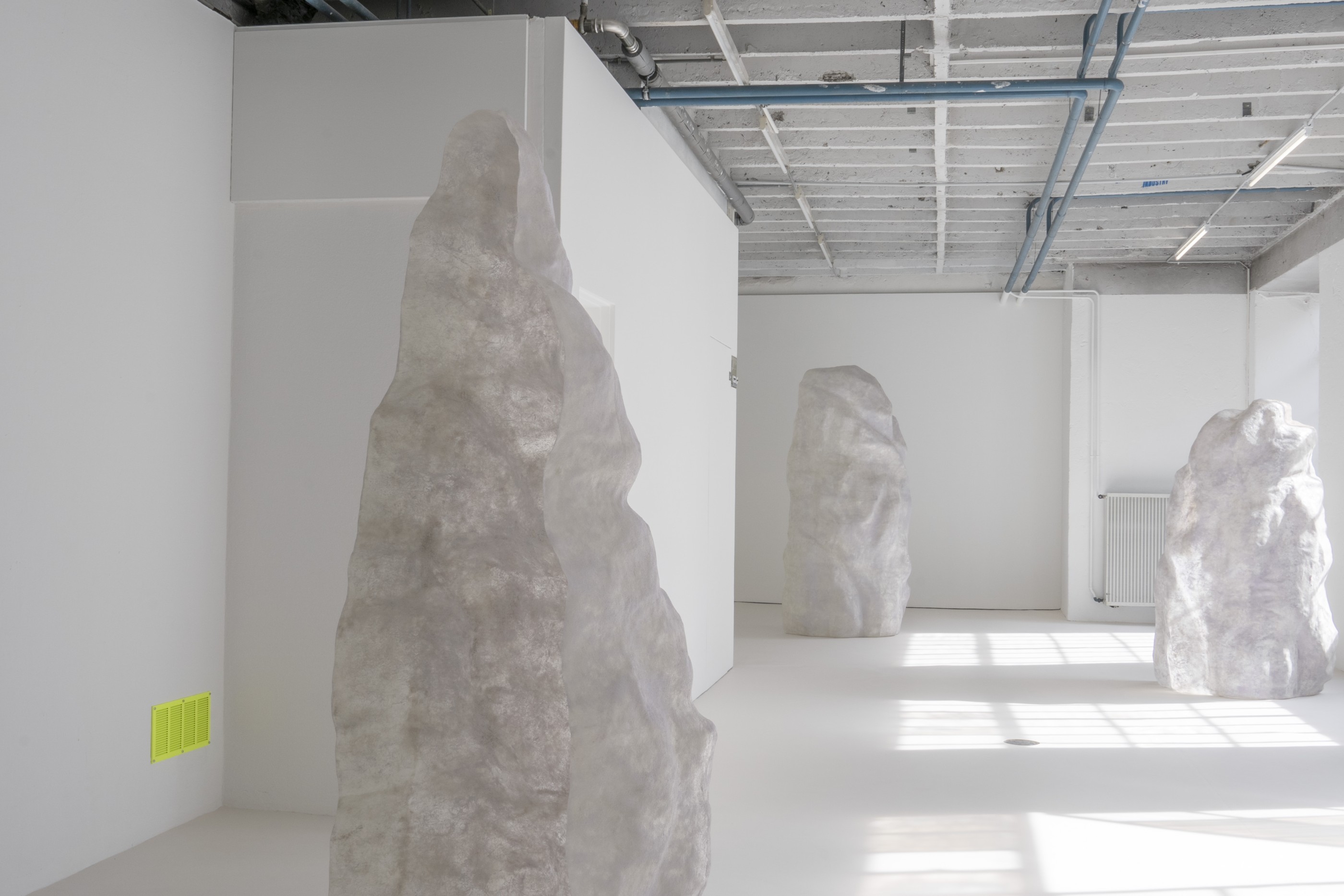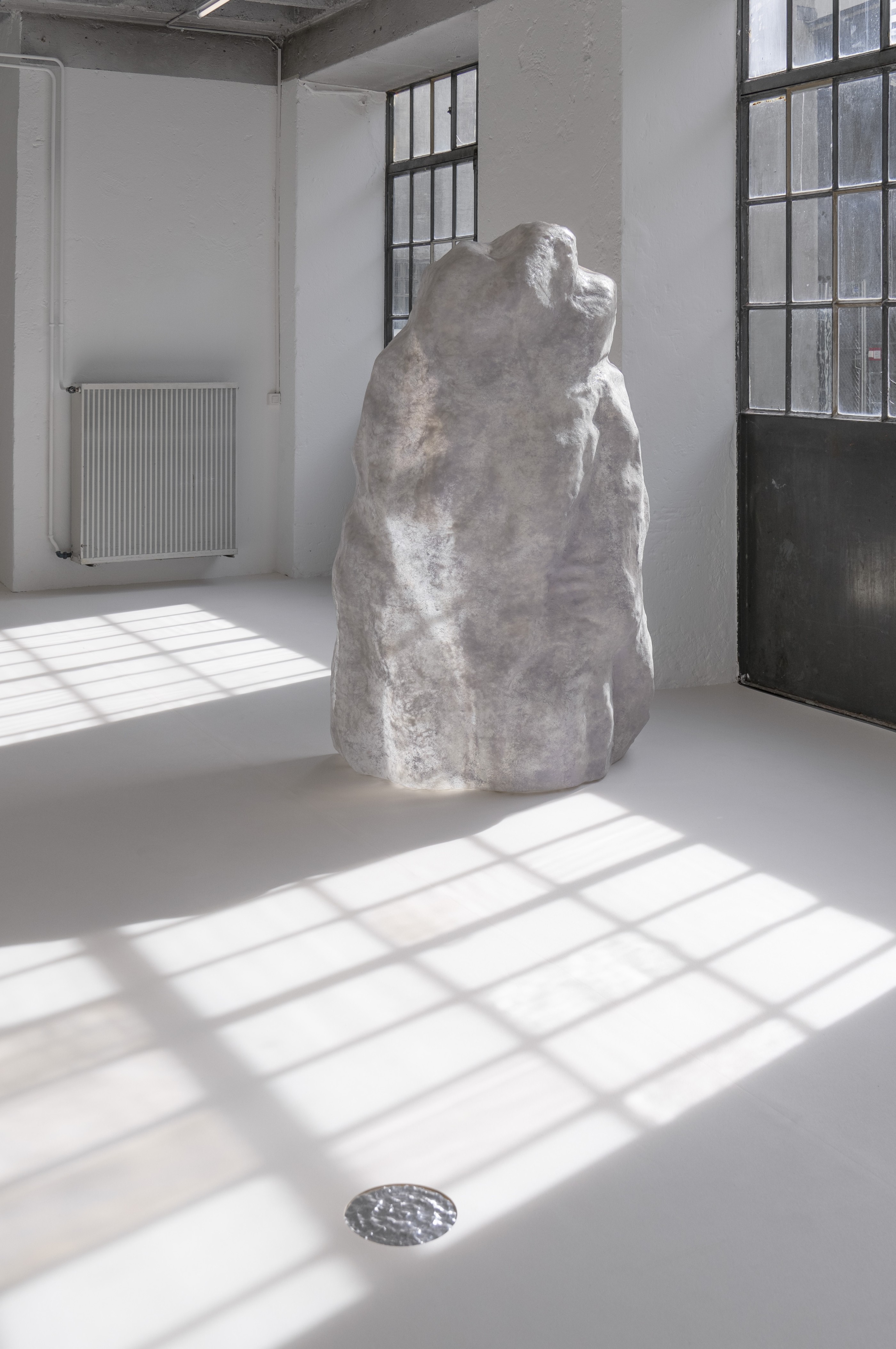 Avec Entre-deux, Pauline Cordier ne déroge pas à ses propres règles. Elle raconte le lien au lieu. L’artiste prend comme point de départ l’histoire de Lausanne, où pierre tendre et cours d’eau en ont dessiné la topographie, et l’architecture de l’espace d’exposition. Il dissimule la roche de la ville et abrite une rivière. Standard/deluxe s’insère entre creux et collines, entretenant une relation secrète aux éléments naturels qui l’entourent. Pour révéler cette relation intime, pour donner à voir des formes invisibles et témoigner de fonctions caduques, l’artiste met en place un dévoilement progressif. Avec des grilles d’aération jaune fluo tout d’abord. En les disséminant sur les murs, Pauline Cordier reproduit et dédouble celles déjà présentes, qui permettent à la roche de respirer. Et avec un couvercle de regard argenté. Moulé sur celui existant et déposé à la surface d’un nouveau sol blanc recréé par l’artiste, il suggère l’écoulement de l’eau et évoque une présence passée. On se souviendrait alors presque que la matière est vivante et mouvante. Puis enfin, avec une frontalité certaine, l’artiste dépose au centre de l’espace trois formes translucides. Nos corps sont confrontés à ces objets qui, en imitant la matérialité de la roche, nous donnent à voir ce que l’on n’a jamais su qui existait. Ou que l’on a simplement oublié et laissé derrière. L’aspect des sculptures, recouvertes de pigments photochromiques, évolue à chaque instant: la lumière qui pénètre par la baie vitrée les fait osciller du gris clair au gris sombre. Le soleil les transforme mais les vide de leurs propriétés physiques : plus le temps défile, plus les pigments meurent.