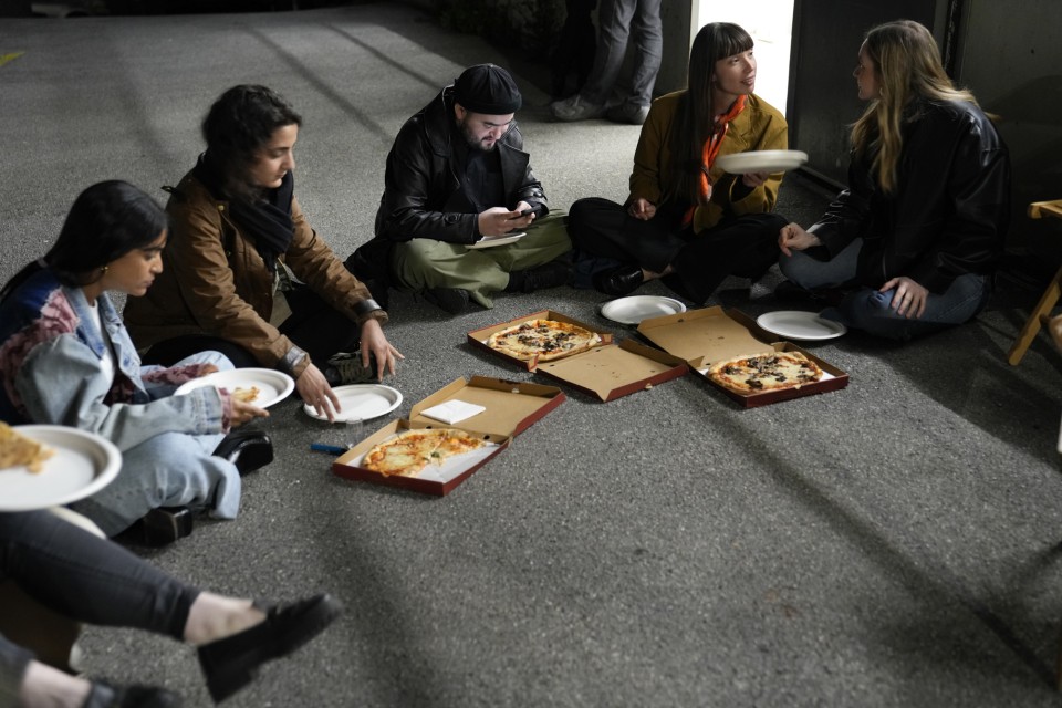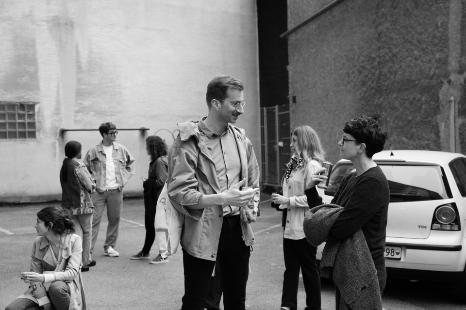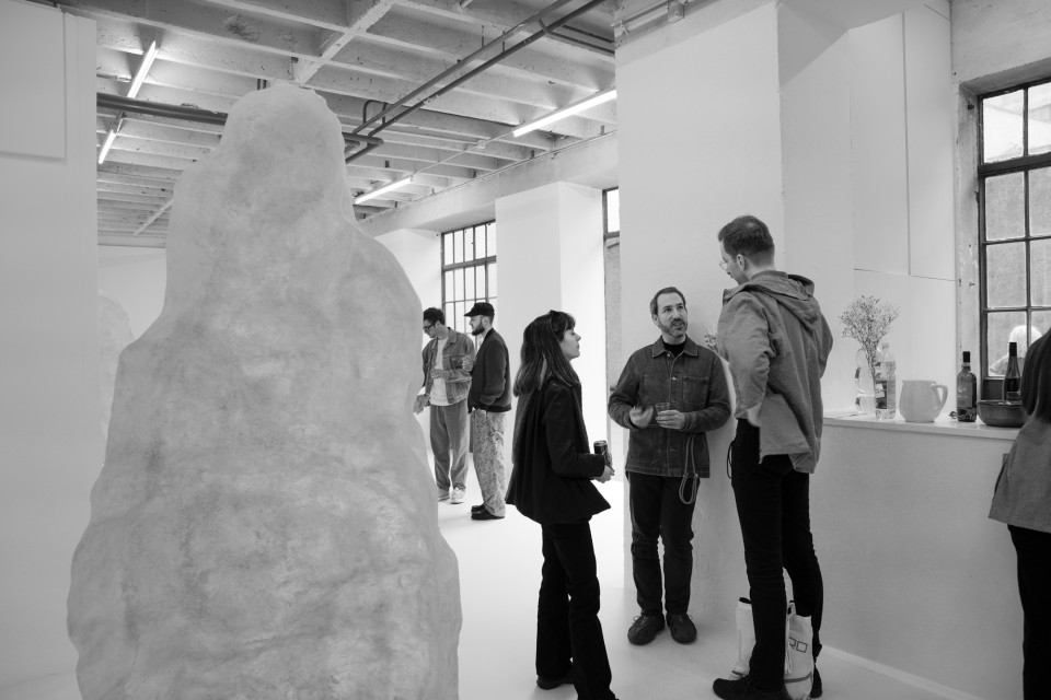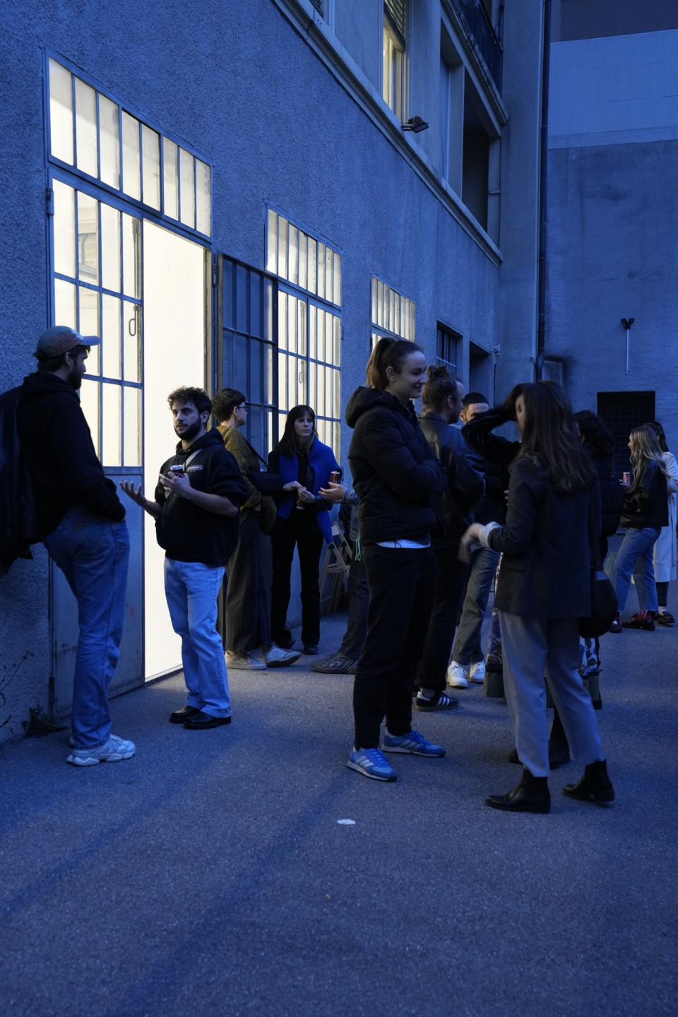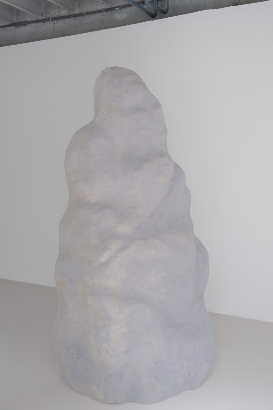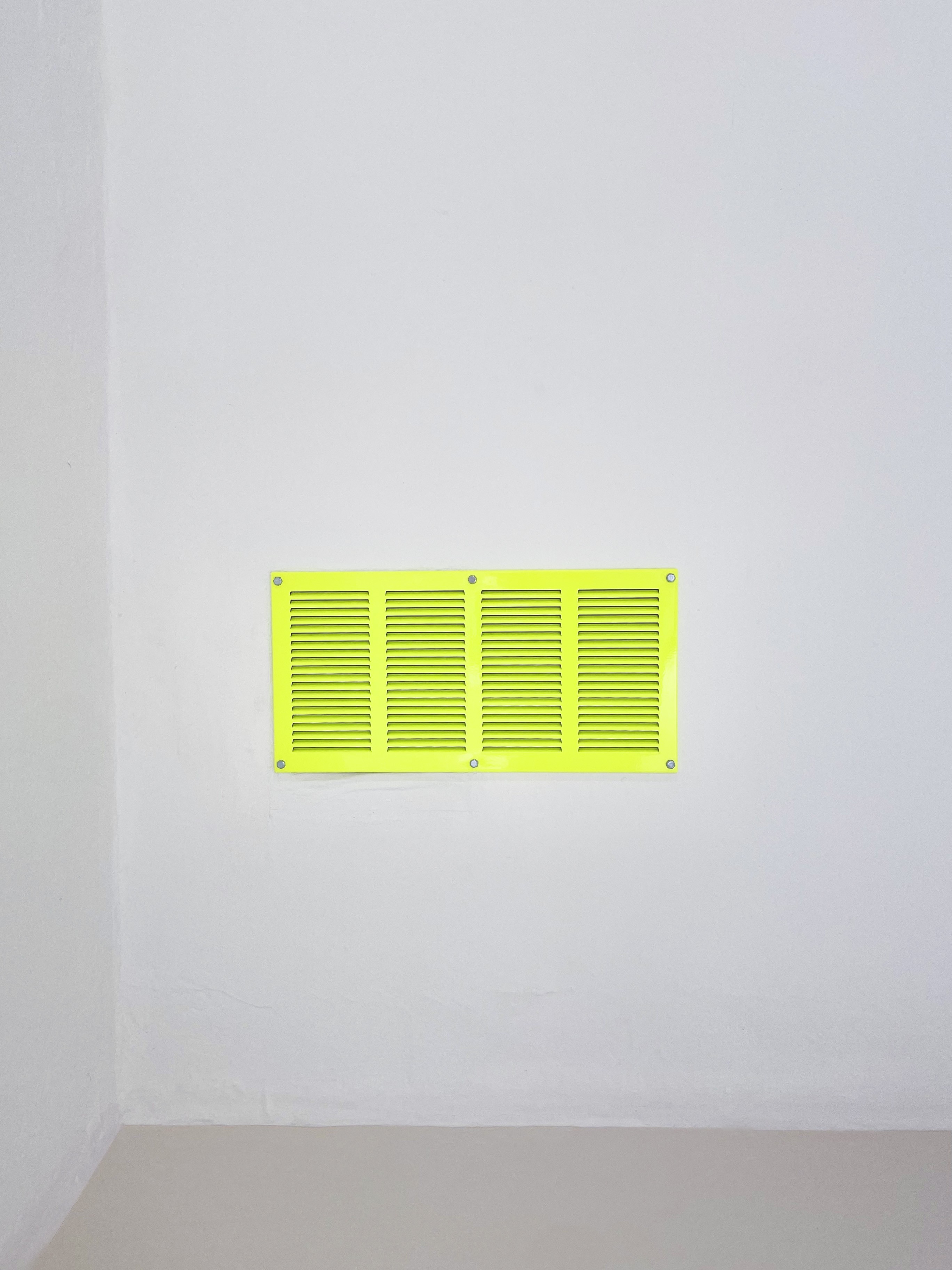 Avec Entre-deux, Pauline Cordier ne déroge pas à ses propres règles. Elle raconte le lien au lieu. L’artiste prend comme point de départ l’histoire de Lausanne, où pierre tendre et cours d’eau en ont dessiné la topographie, et l’architecture de l’espace d’exposition. Il dissimule la roche de la ville et abrite une rivière. Standard/deluxe s’insère entre creux et collines, entretenant une relation secrète aux éléments naturels qui l’entourent. Pour révéler cette relation intime, pour donner à voir des formes invisibles et témoigner de fonctions caduques, l’artiste met en place un dévoilement progressif. Avec des grilles d’aération jaune fluo tout d’abord. En les disséminant sur les murs, Pauline Cordier reproduit et dédouble celles déjà présentes, qui permettent à la roche de respirer. Et avec un couvercle de regard argenté. Moulé sur celui existant et déposé à la surface d’un nouveau sol blanc recréé par l’artiste, il suggère l’écoulement de l’eau et évoque une présence passée. On se souviendrait alors presque que la matière est vivante et mouvante. Puis enfin, avec une frontalité certaine, l’artiste dépose au centre de l’espace trois formes translucides. Nos corps sont confrontés à ces objets qui, en imitant la matérialité de la roche, nous donnent à voir ce que l’on n’a jamais su qui existait. Ou que l’on a simplement oublié et laissé derrière. L’aspect des sculptures, recouvertes de pigments photochromiques, évolue à chaque instant: la lumière qui pénètre par la baie vitrée les fait osciller du gris clair au gris sombre. Le soleil les transforme mais les vide de leurs propriétés physiques : plus le temps défile, plus les pigments meurent.