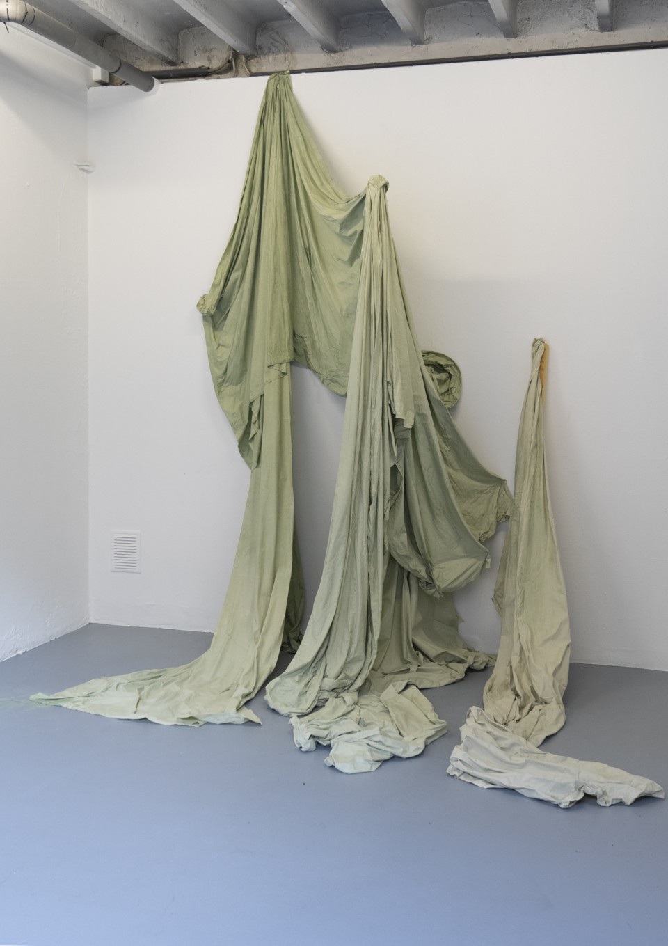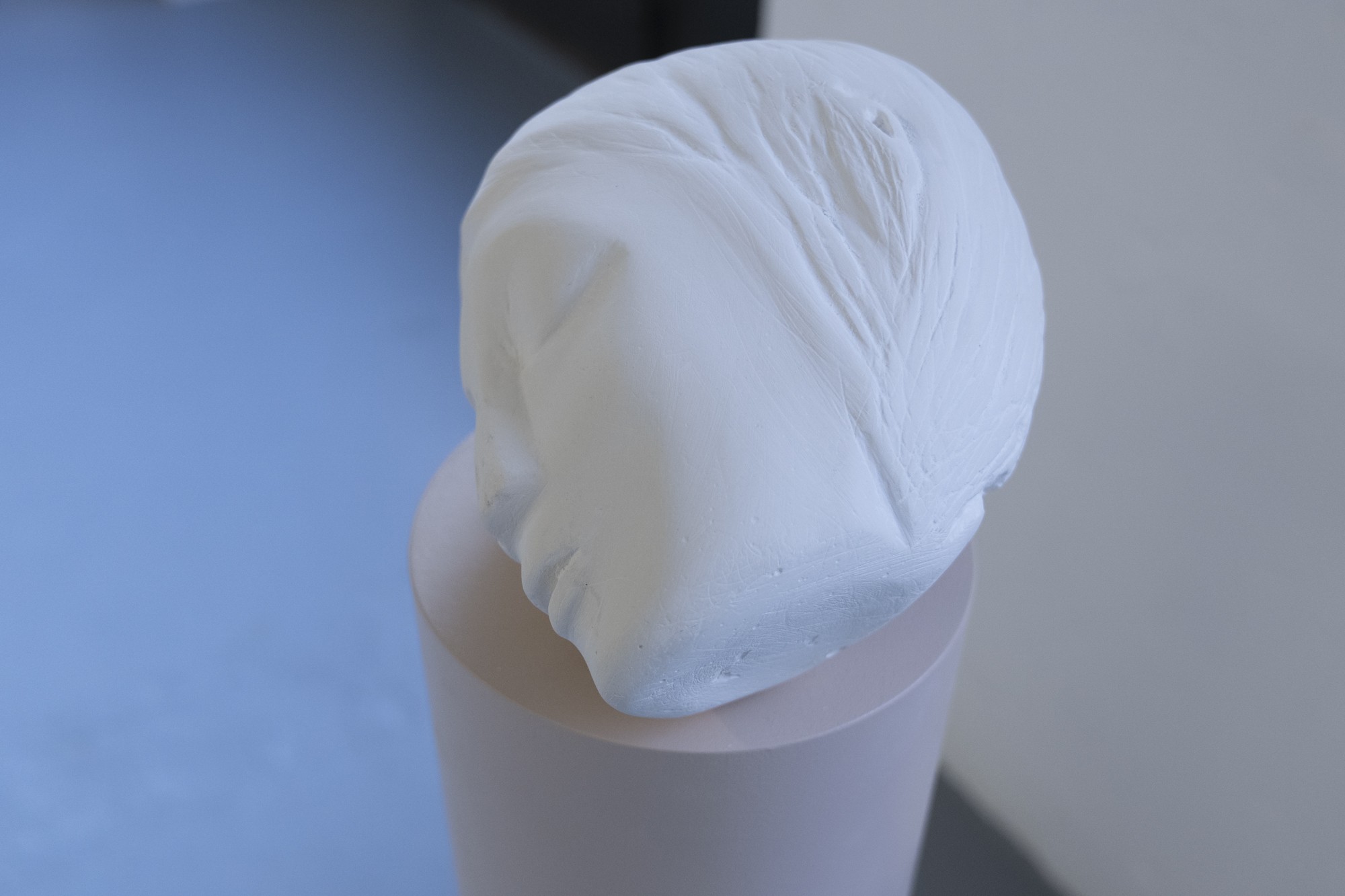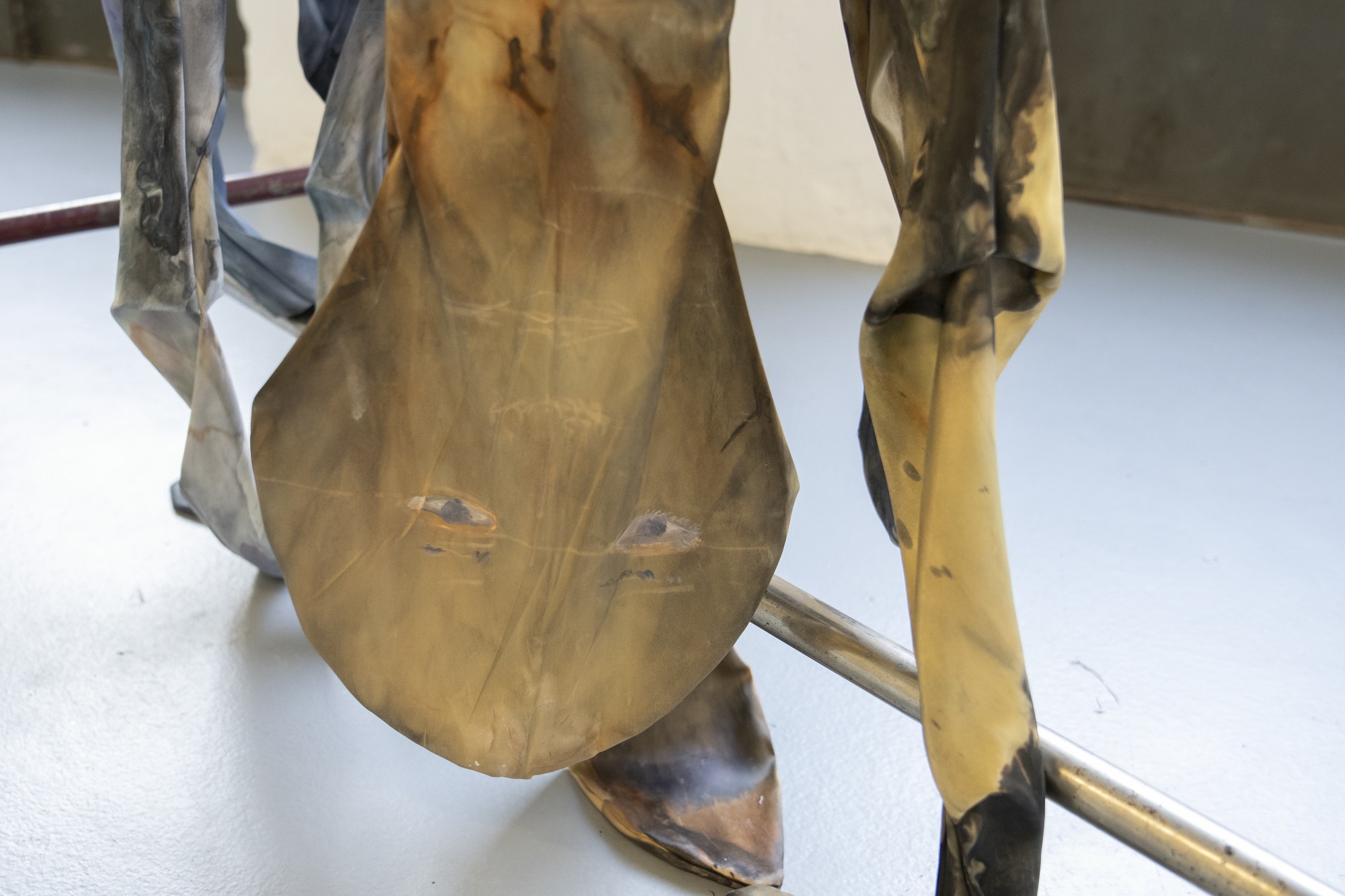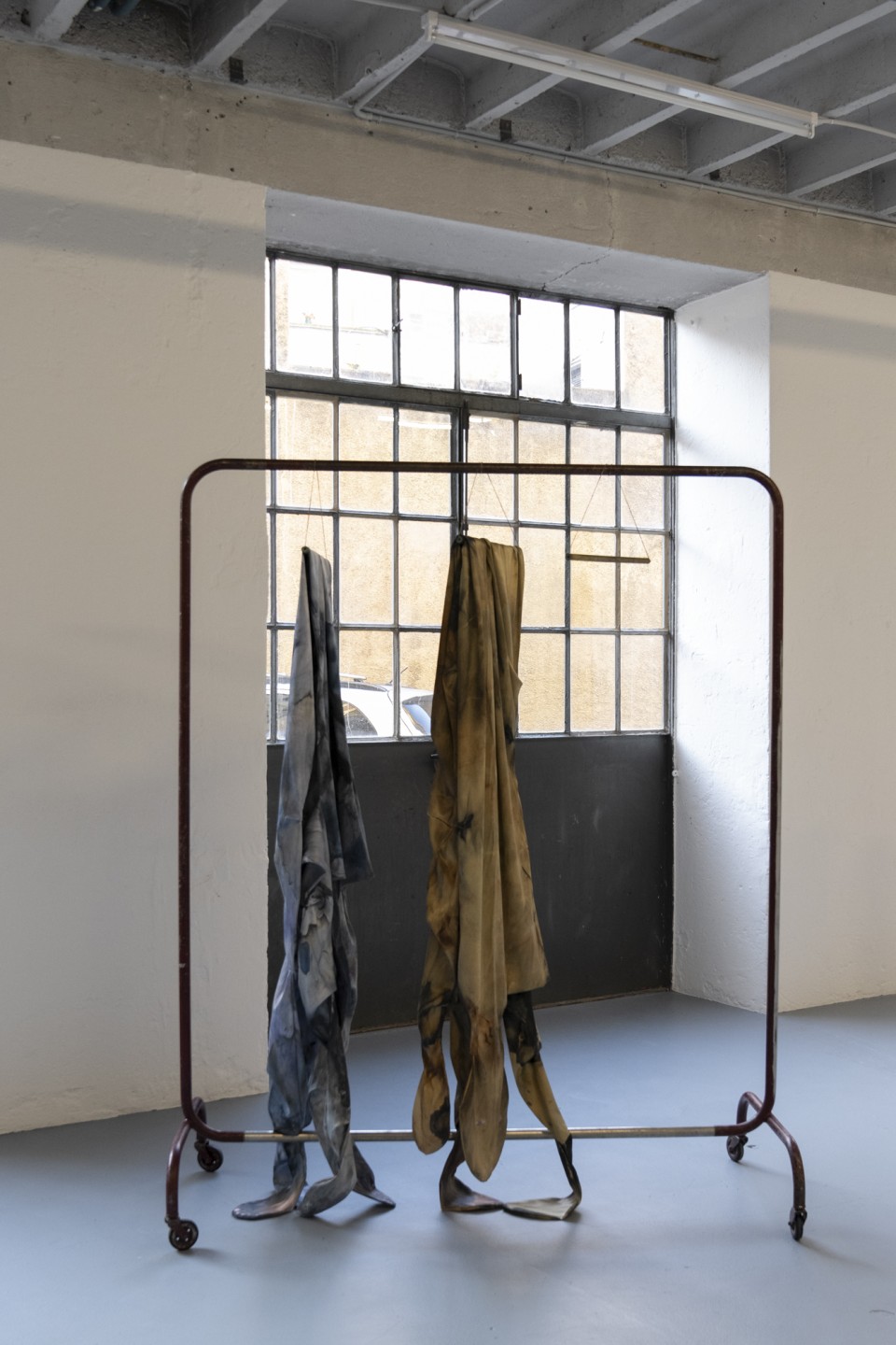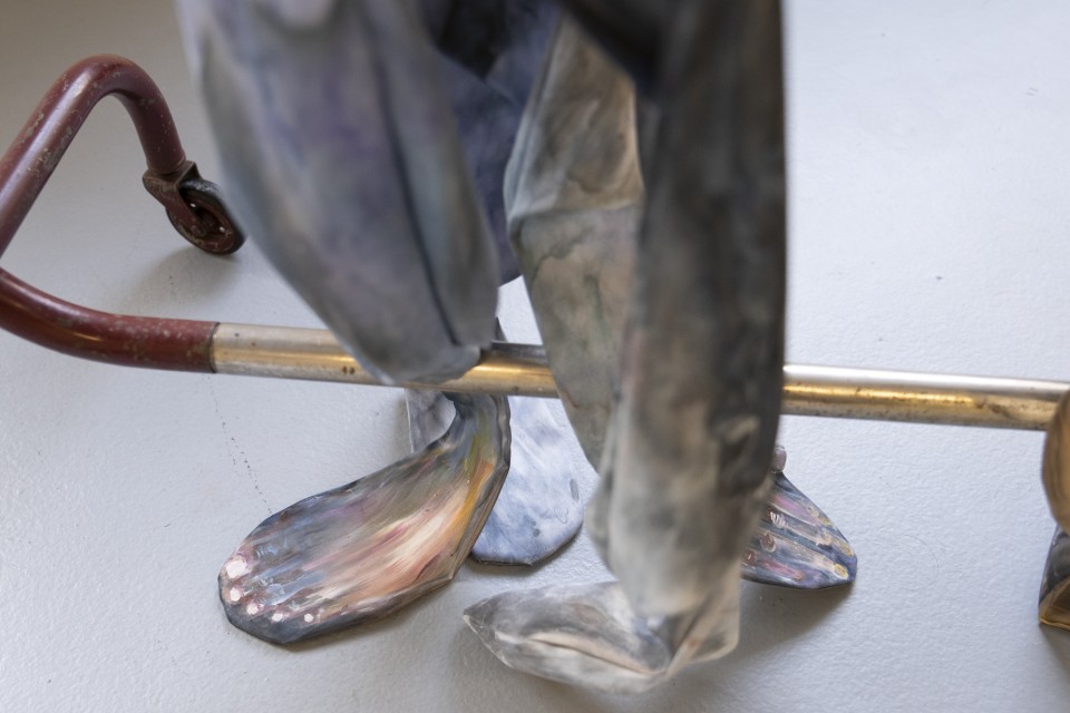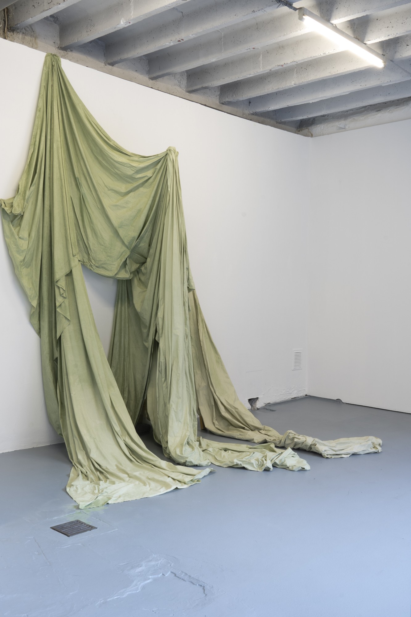 Il y a dans le travail de Céline Peruzzo une désarmante déambulation entre les époques, elle fait référence avec ses «dipinti» aux drapés antiques qui se figent sur des statues de déesses grecques, elle nous prépare des costumes démesurés de femmes grenouilles d’un temps futuriste et nous rappelle au modernisme avec sa tête à la Brancusi. Les références sont affichées, ce sont des hommages, des déambulations dans l’histoire de l’art. Céline met en place des accessoires, des objets, un décor pour une pièce de théâtre imaginaire, une scène dans laquelle les protagonistes étaient/sont/seront des femmes.