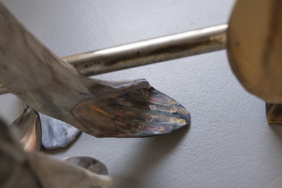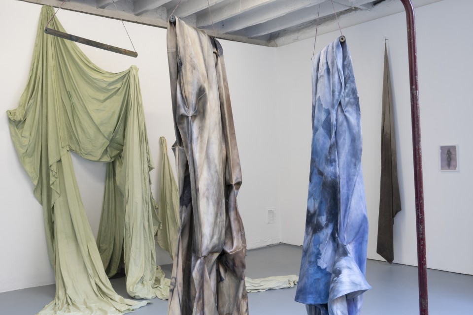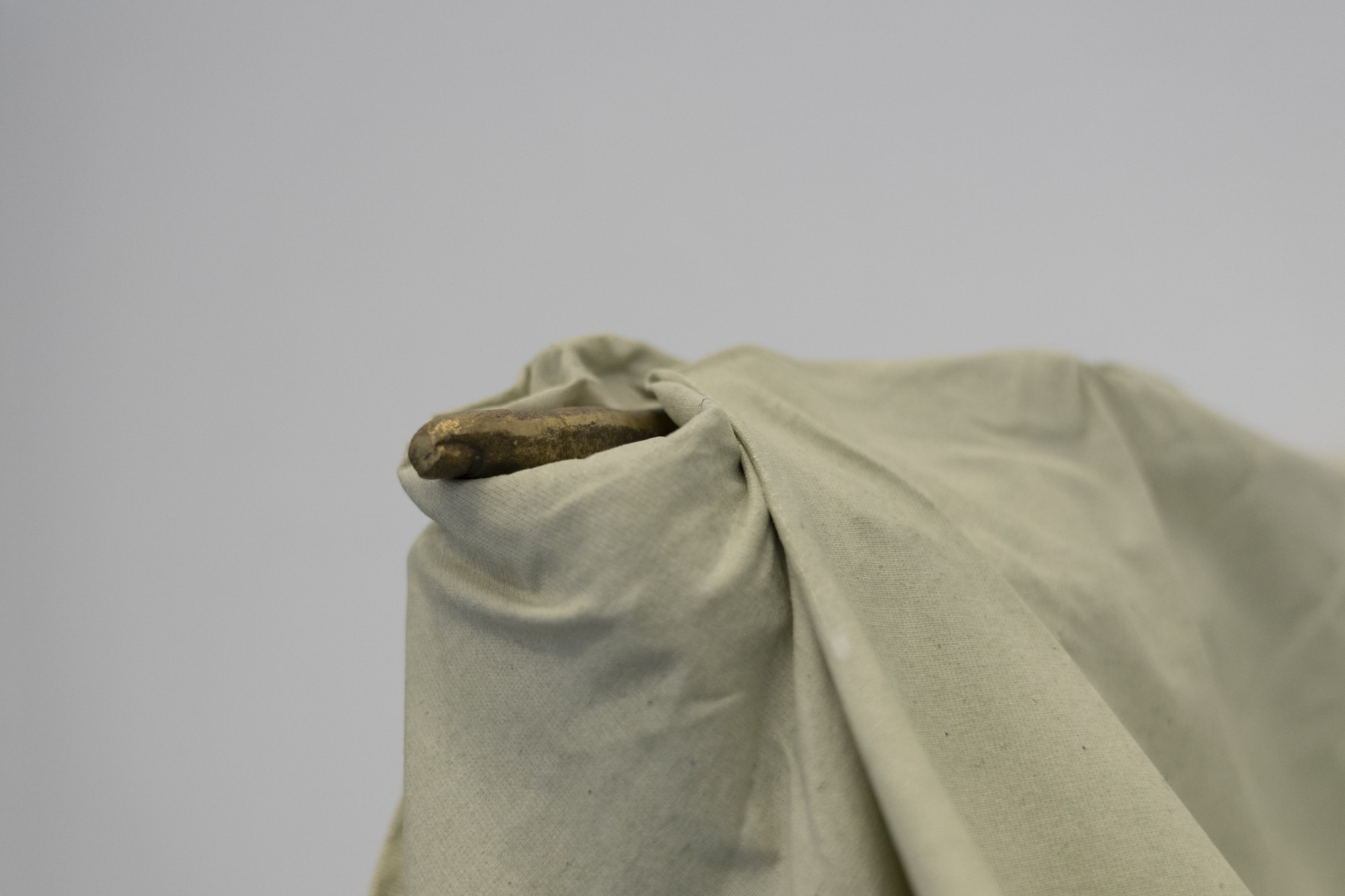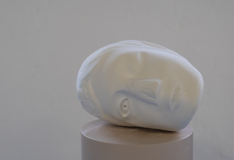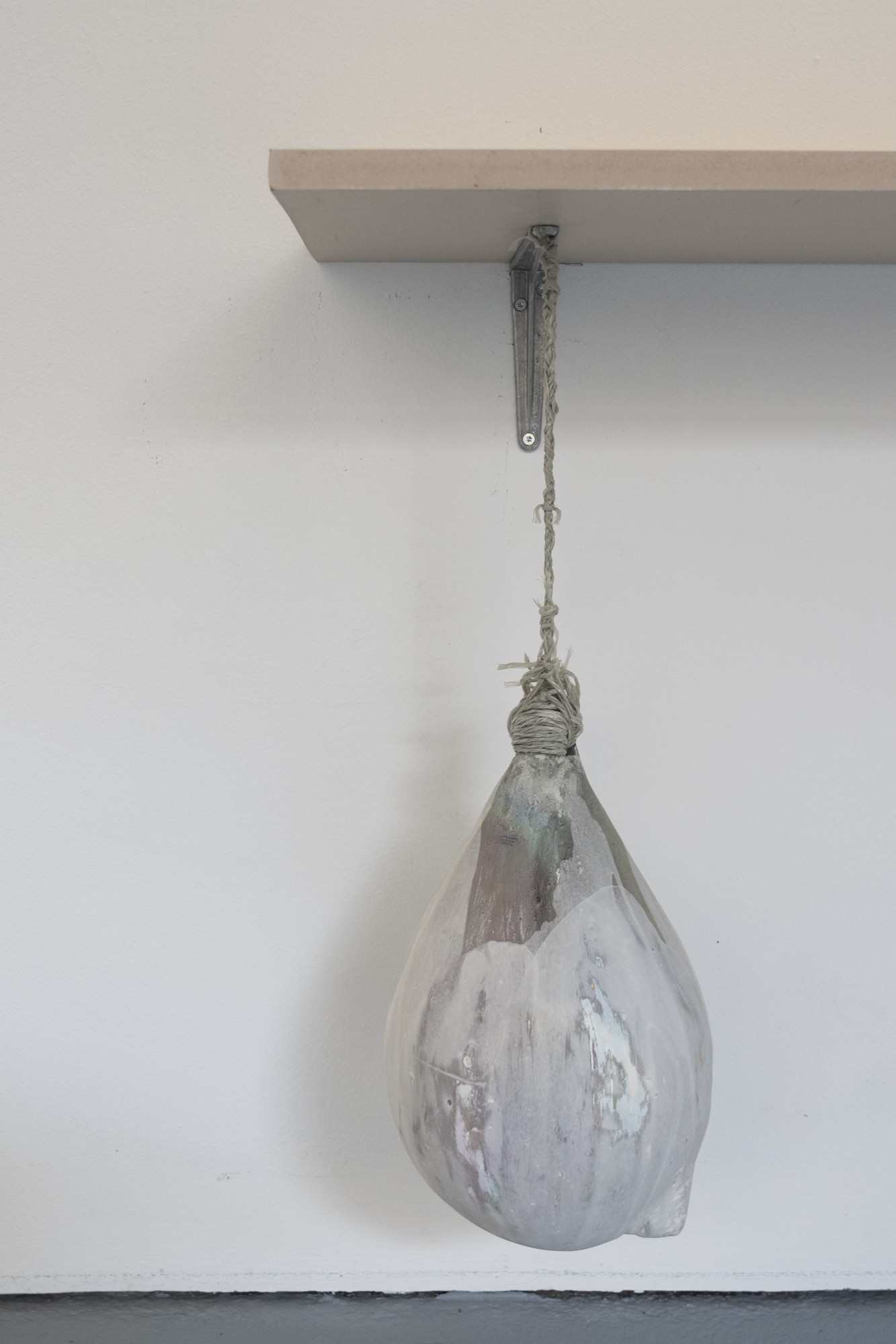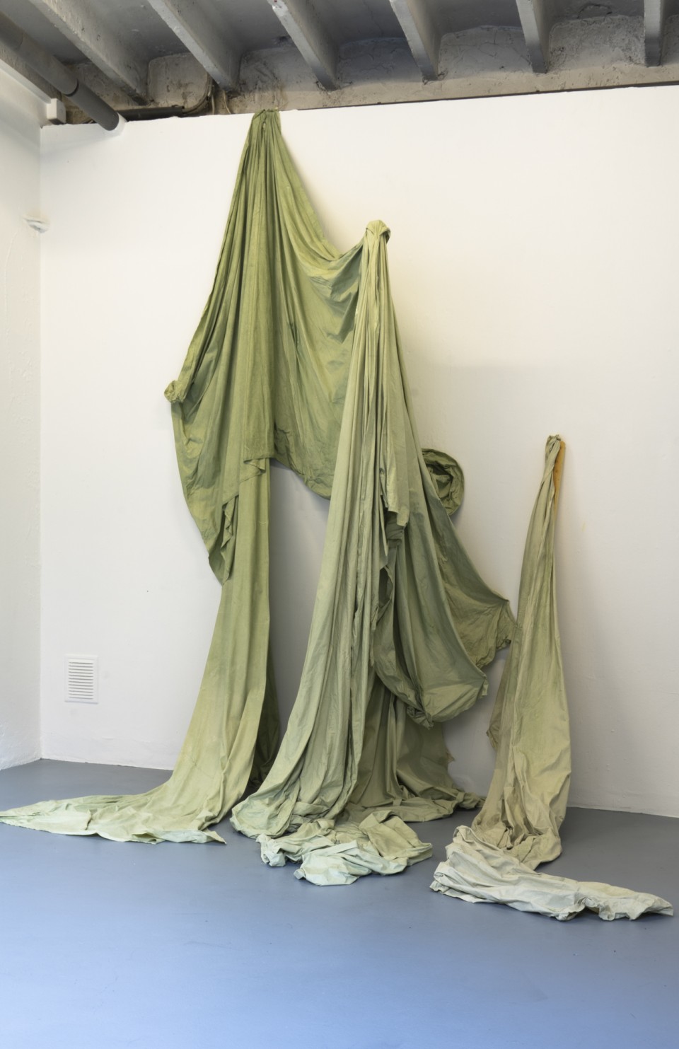 Il y a dans le travail de Céline Peruzzo une désarmante déambulation entre les époques, elle fait référence avec ses «dipinti» aux drapés antiques qui se figent sur des statues de déesses grecques, elle nous prépare des costumes démesurés de femmes grenouilles d’un temps futuriste et nous rappelle au modernisme avec sa tête à la Brancusi. Les références sont affichées, ce sont des hommages, des déambulations dans l’histoire de l’art. Céline met en place des accessoires, des objets, un décor pour une pièce de théâtre imaginaire, une scène dans laquelle les protagonistes étaient/sont/seront des femmes.